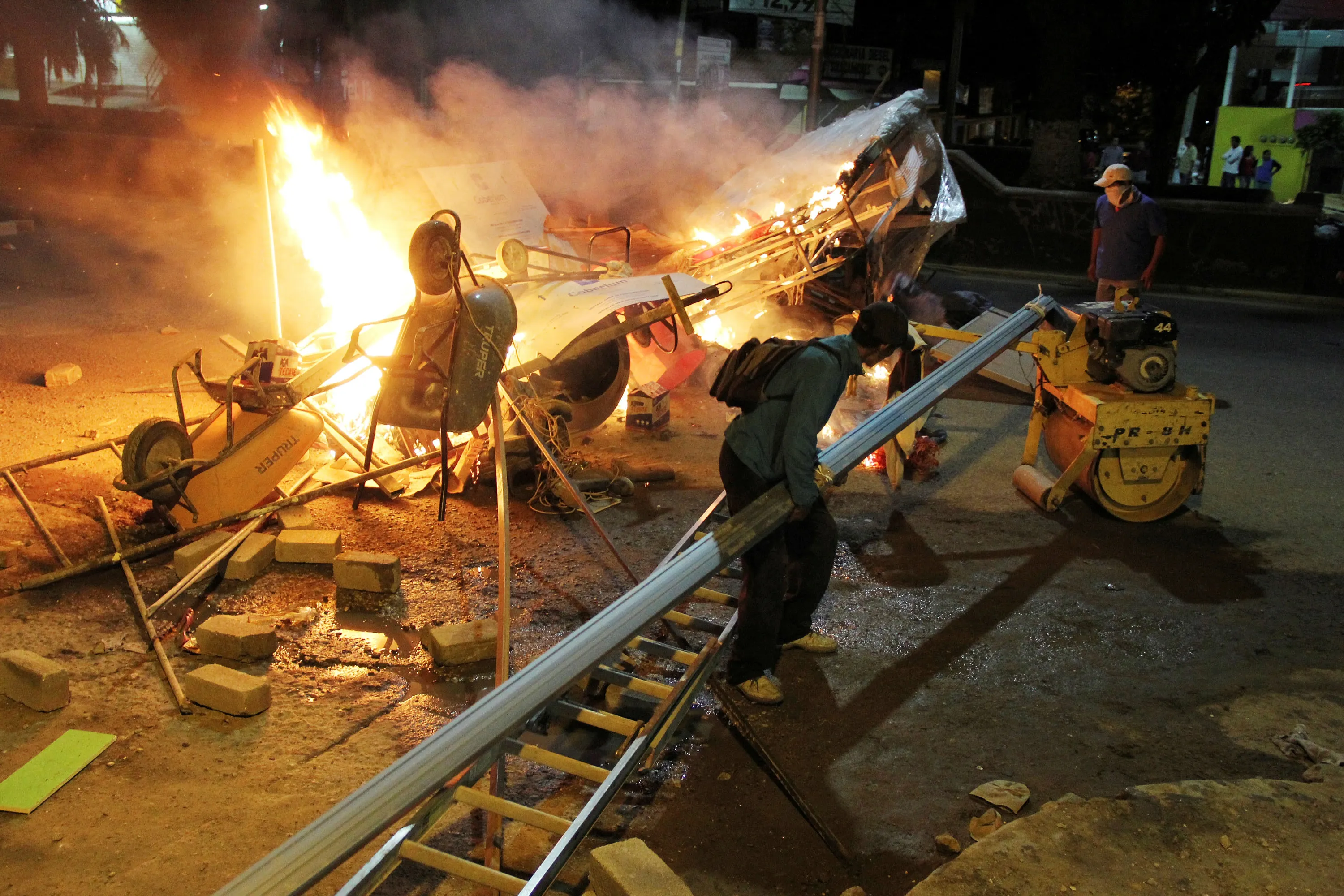 Members of the National Coordination of Education Workers (CNTE) teachers union set off a burning barricade after clashes erupted during an eviction from the Oaxaca State Institute of Public Education (IEEPO) facilities in Oaxaca, Mexico, June 11, 2016. (Photo by Jorge Luis Plata/Reuters)