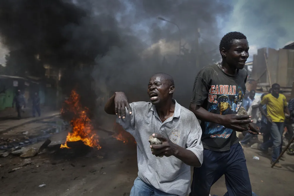 Opposition supporters react in front of a burning barricade they set up in the Kibera slum of Nairobi, Kenya, as they protest against an MP Moses Kuria of the ruling Jubilee coalition who allegedly called for the assassination of opposition leader Raila Odinga, June 14, 2016. (Photo by Dai Kurokawa/EPA)