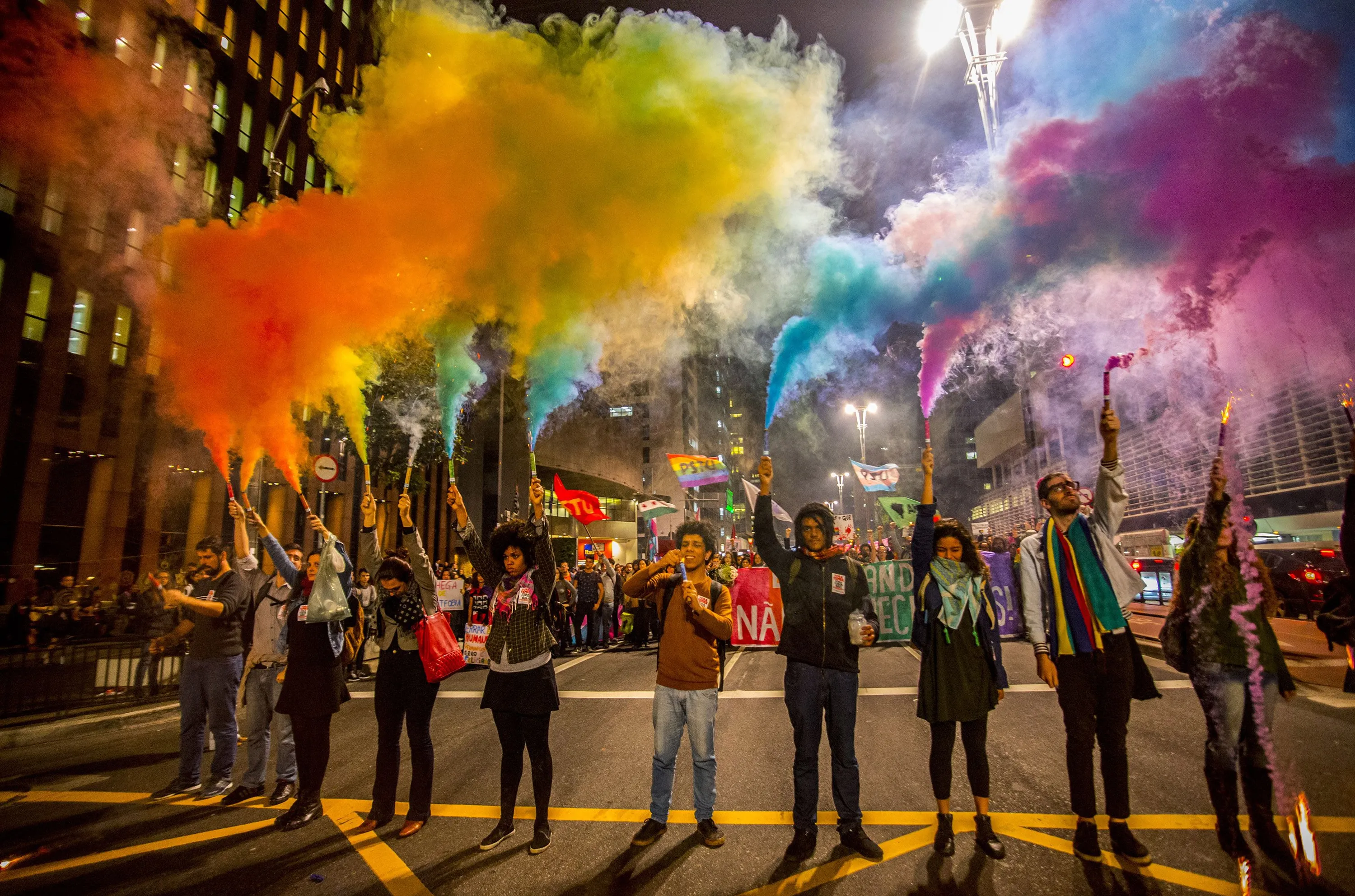 Activists light up flares of the LGBT colors during a vigil in memory of victims of the mass shooting at the Pulse gay night club in Orlando, in Sao Paulo, Brazil on June 16, 2016. (Photo by ZUMA Wire/Rex Features/Shutterstock)