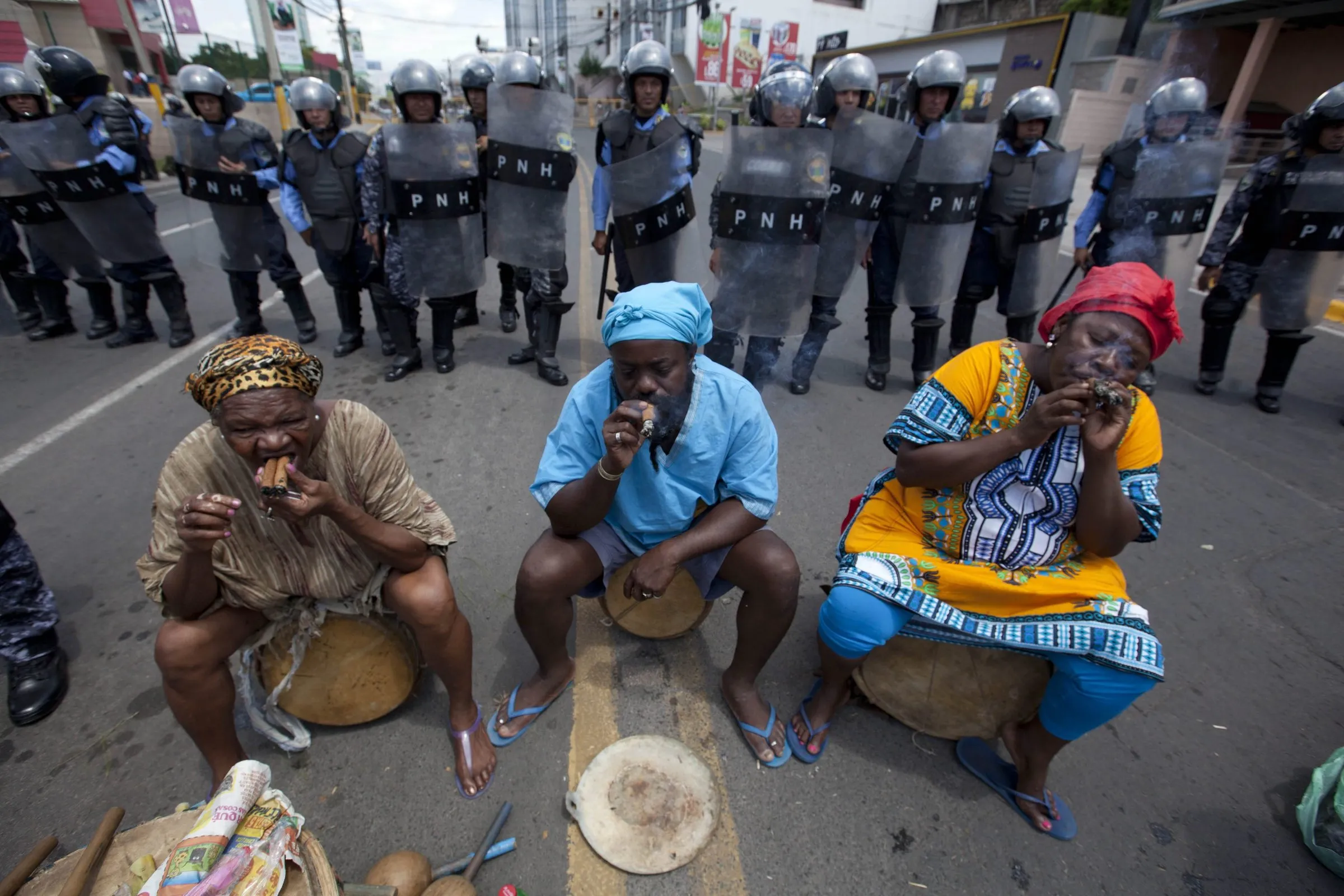 Indigenous Garífunas perform ritual during a protest to demand justice in the case of the Honduran killed indigenous and environmental leader Berta Caceres, in a street that gives access to the presidential residence, in Tegucigalpa, Honduras, 15 June 2016. (Photo by Gustavo Amador/EPA)
