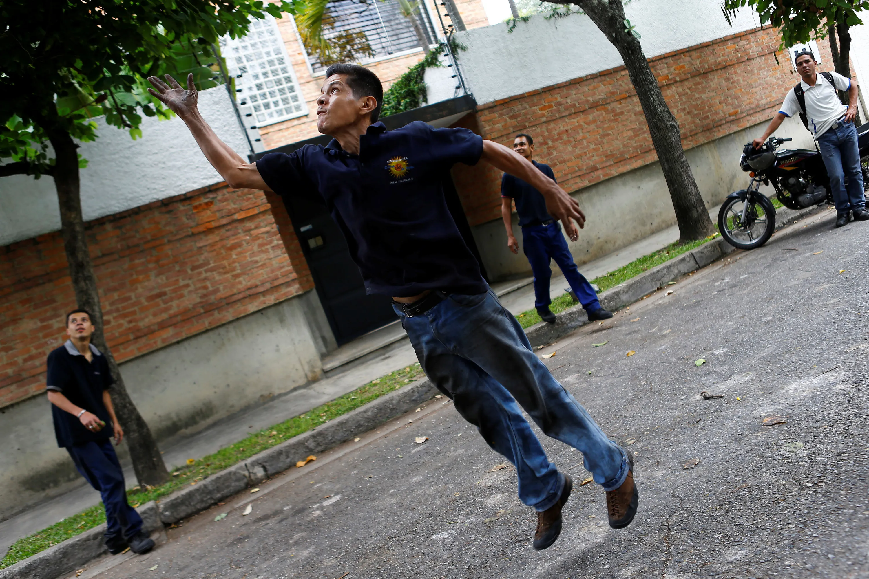 A worker jumps as he throw an object towards a mango tree to try to dislodge the fruits during their lunch break in Caracas, Venezuela, June 17, 2016. (Photo by Ivan Alvarado/Reuters)