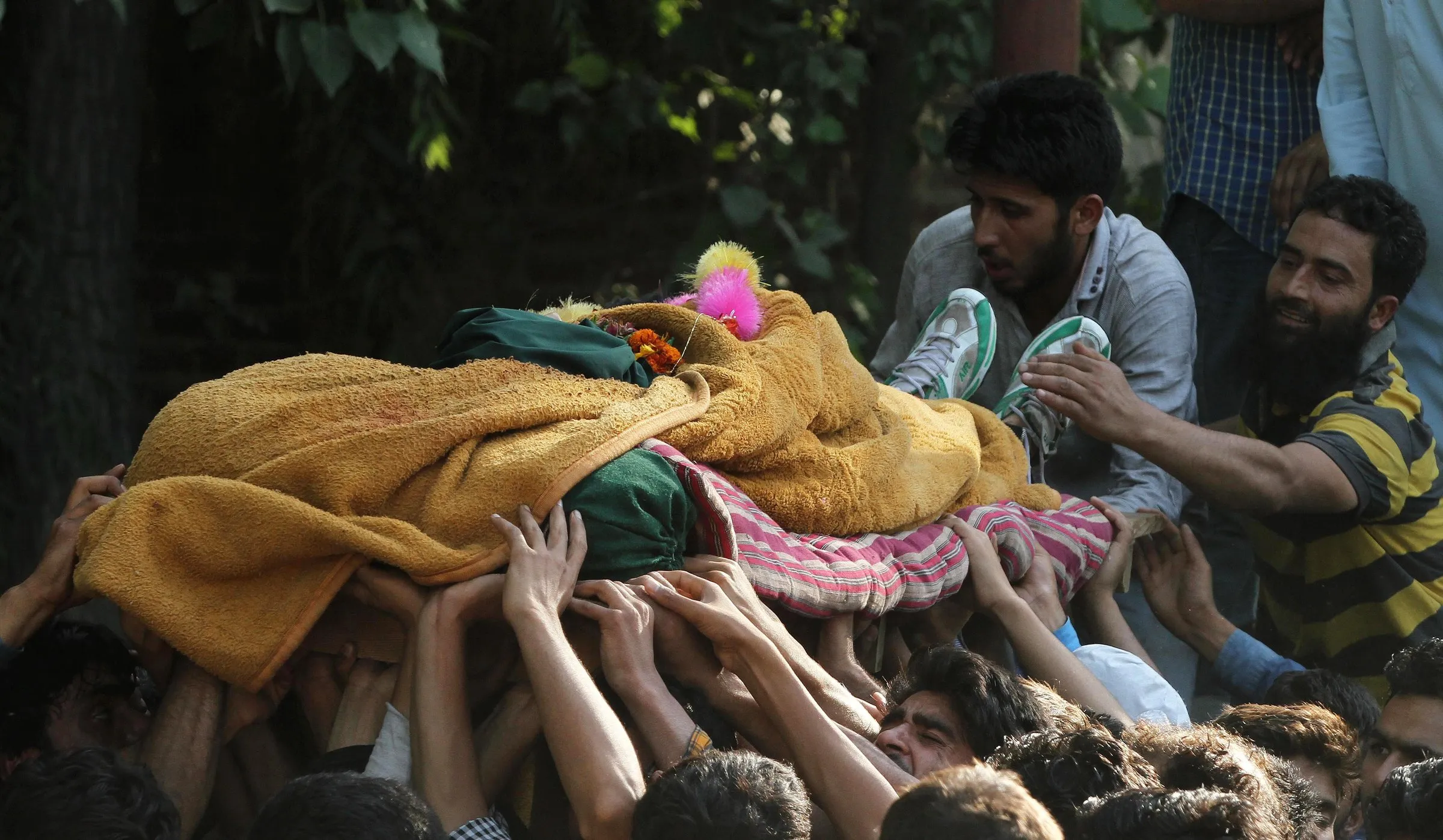 A Kashmiri villager stretches out to touch the body of Manzoor Ahmad, a suspected militant commander, being carried for his funeral at Pulwama, about 49 kilometres (31 miles) south of Srinagar, India, Thursday, June 30, 2016. Indian forces killed two suspected rebels in a clash Thursday in Indian-controlled Kashmir, and dispersed hundreds of protesters who took to the streets to show their solidarity with the rebels, an official said. (Photo by Mukhtar Khan/AP Photo)