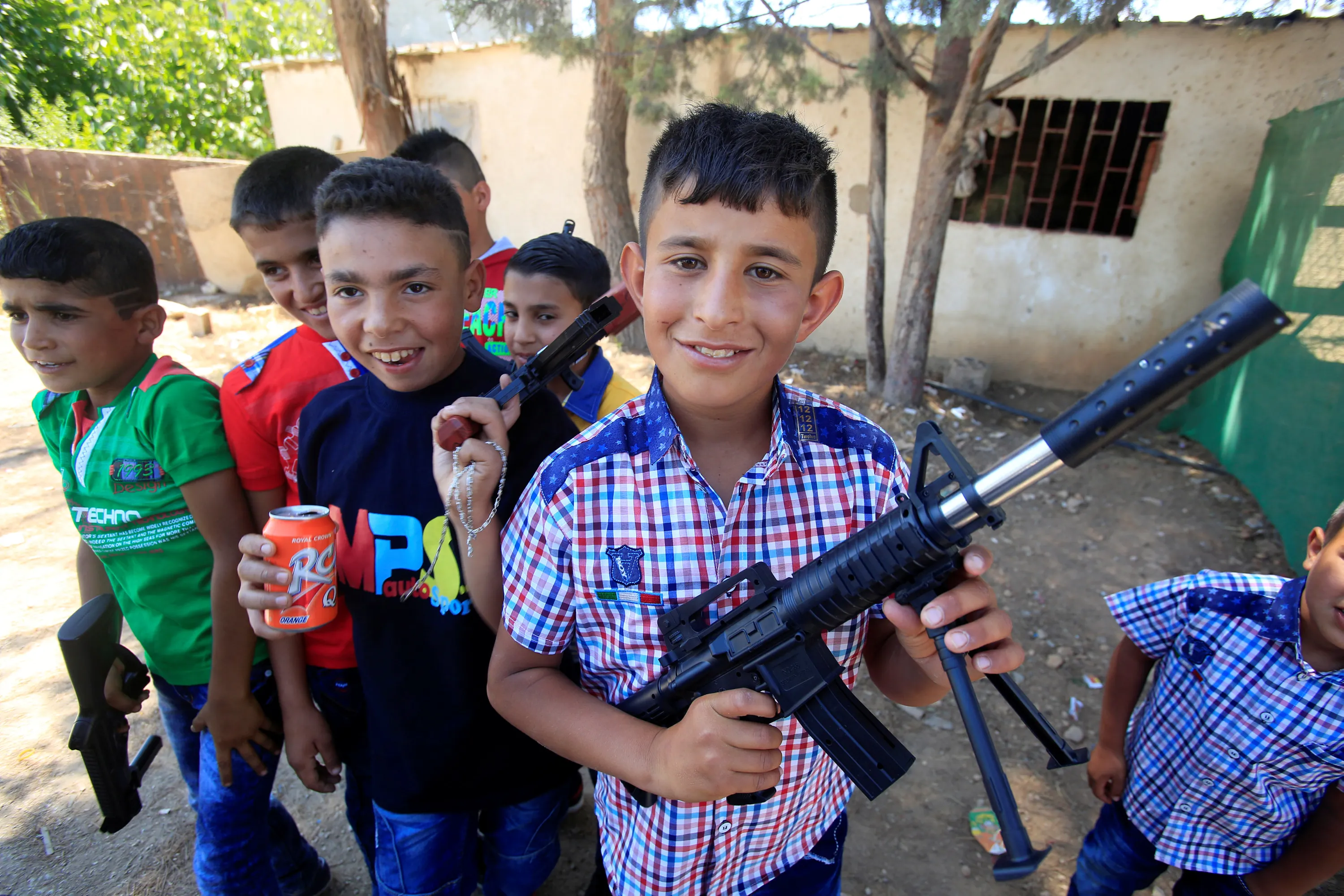 Syrian boys living in the refugee camp of Delhemiyeh village, hold their toy guns as they celebrate Eid al-Fitr, near Zahleh town in the Bekaa valley in eastern Lebanon July 6, 2016. (Photo by Jamal Saidi/Reuters)
