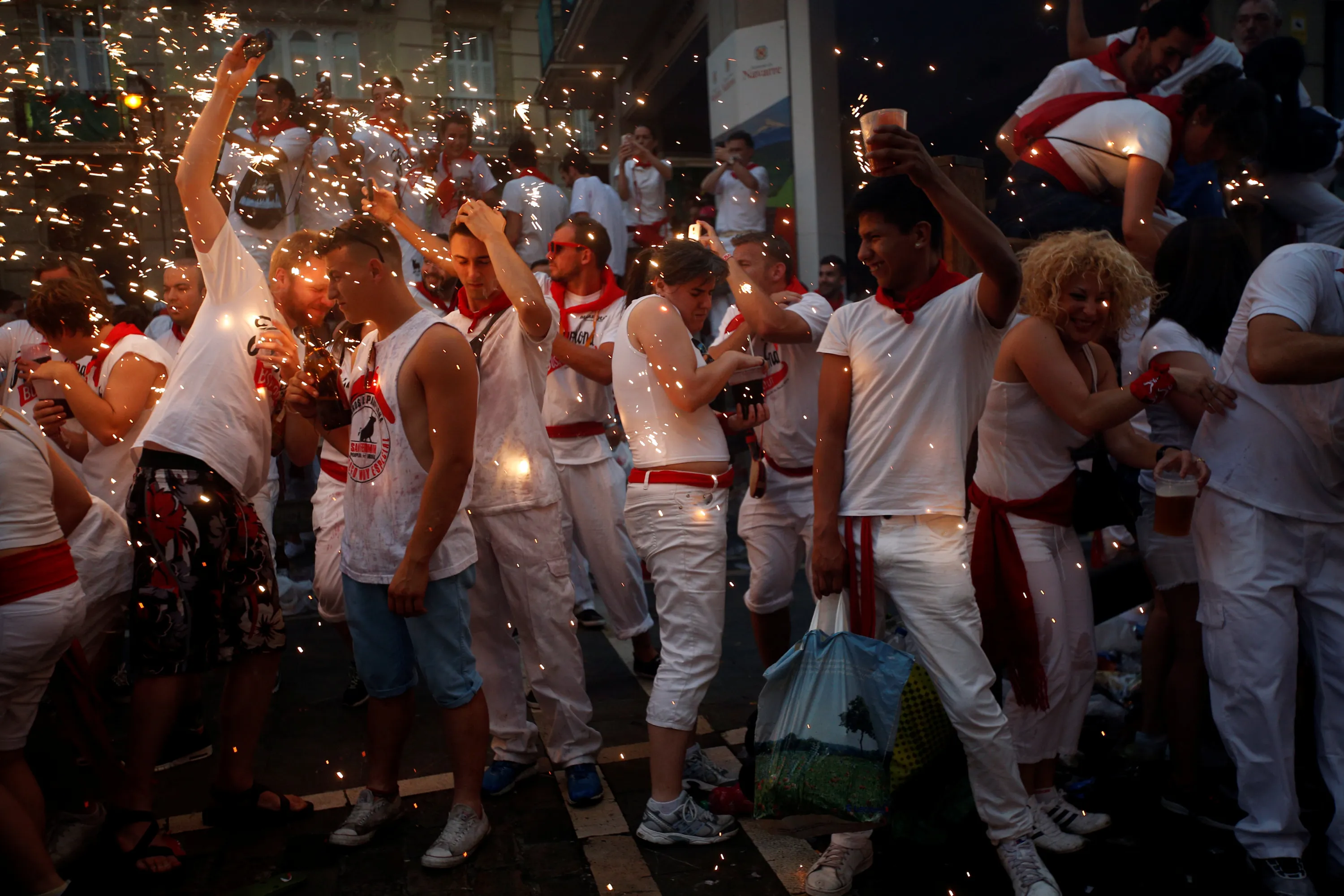 Revellers are showered in sparks from the “Fire Bull”, a man carrying a metal structure shaped like a bull and loaded with fireworks, during the San Fermin festival in Pamplona, northern Spain, July 9, 2016. (Photo by Susana Vera/Reuters)