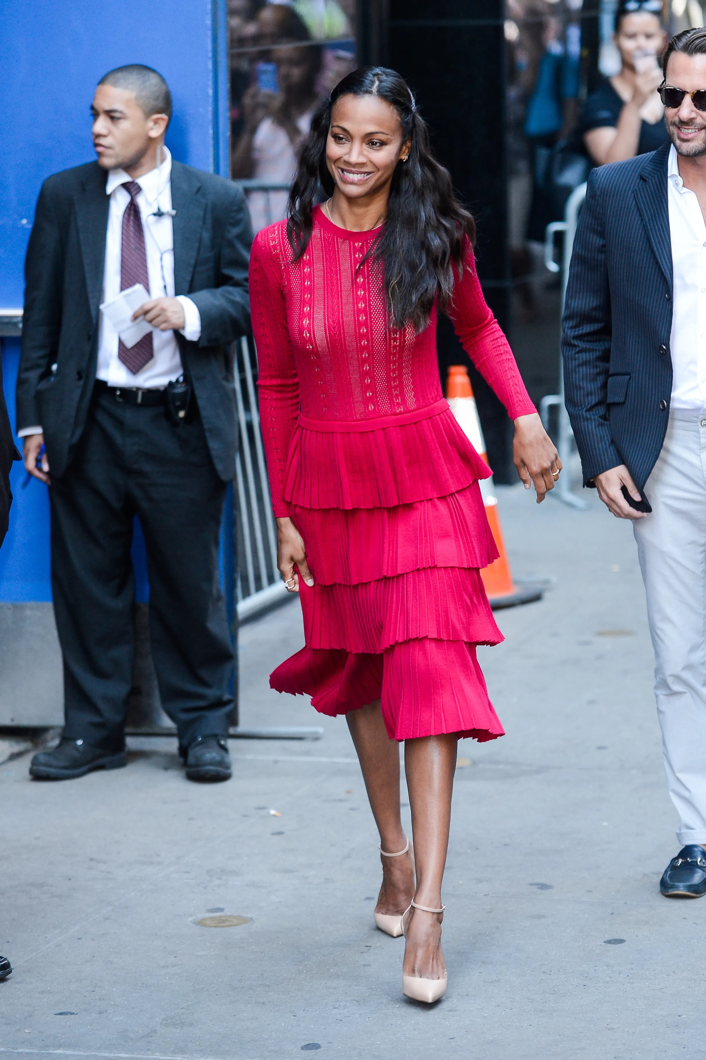 Actress Zoe Saldana leaves the “Good Morning America” taping at ABC Times Square Studios on July 18, 2016 in New York City. (Photo by Ray Tamarra/GC Images)