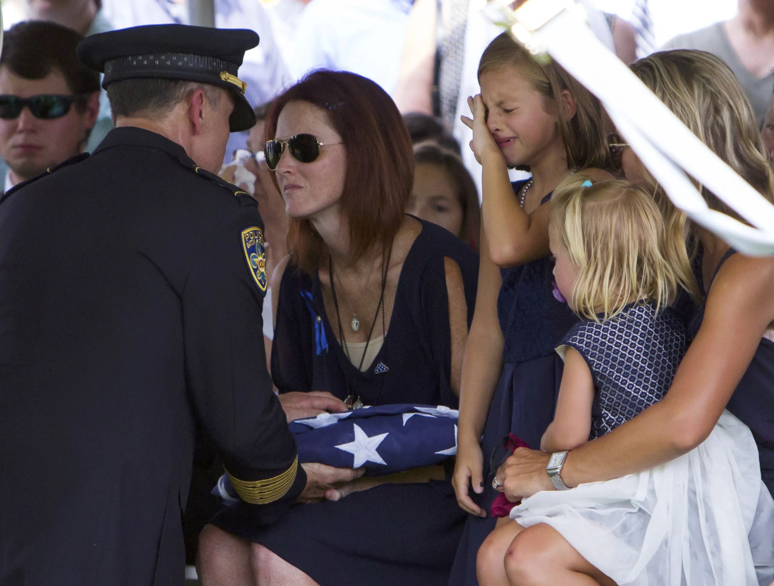 Baton Rouge police chief Carl Dabadie, Jr. presents the American flag to Dechia Gerald, during burial services for her husband, Baton Rouge police officer Matthew Gerald, one of three officers killed by a gunman the week before, at Louisiana National Cemetery in Zachary, Louisiana, U.S., July 22, 2016. (Photo by Jeffrey Dubinksy/Reuters)
