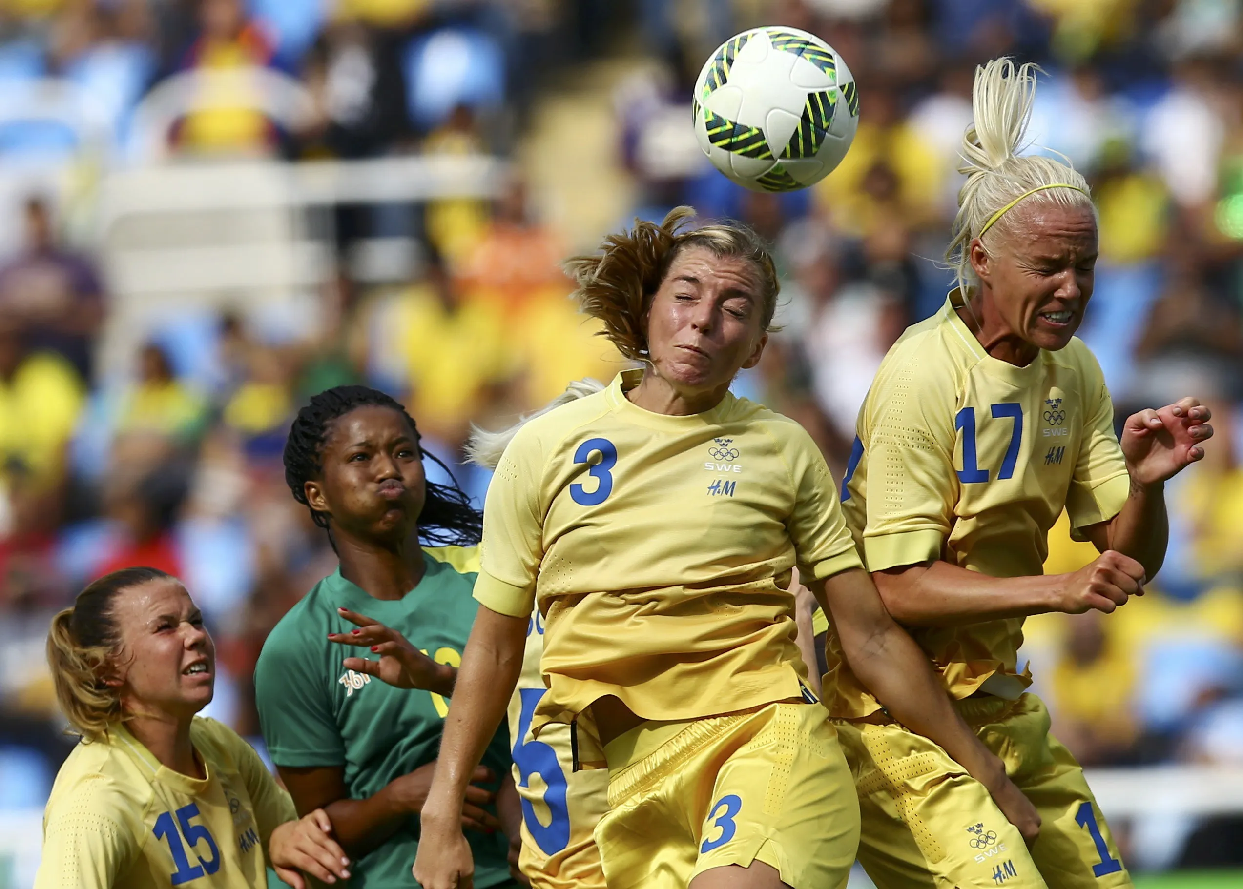 Soccer, Preliminary, Women's First Round, Group E Sweden vs South Africa, Olympic Stadium in Rio de Janeiro, Brazil on August 3, 2016.Jessica Samuelsson, Linda Sembrant and Caroline Seger (SWE) of Sweden in action. (Photo by Leonhard Foeger/Reuters)