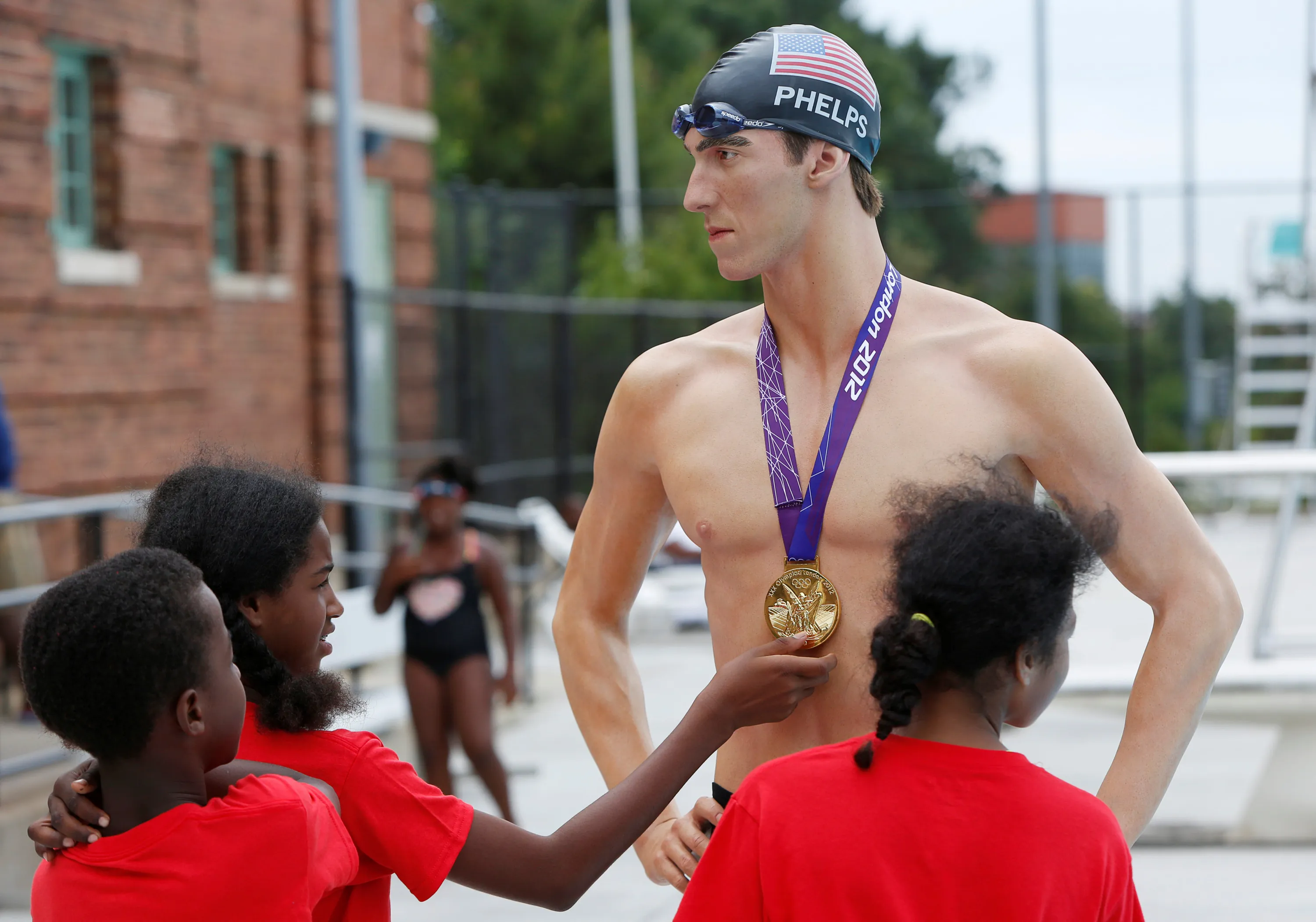 Young swimmers admire a Madame Tussauds Museum figure of U.S. Olympic gold medal swimmer Michael Phelps at Banneker Pool in Washington, U.S., to coincide with the opening of the Rio Olympics August 5, 2016. (Photo by Gary Cameron/Reuters)