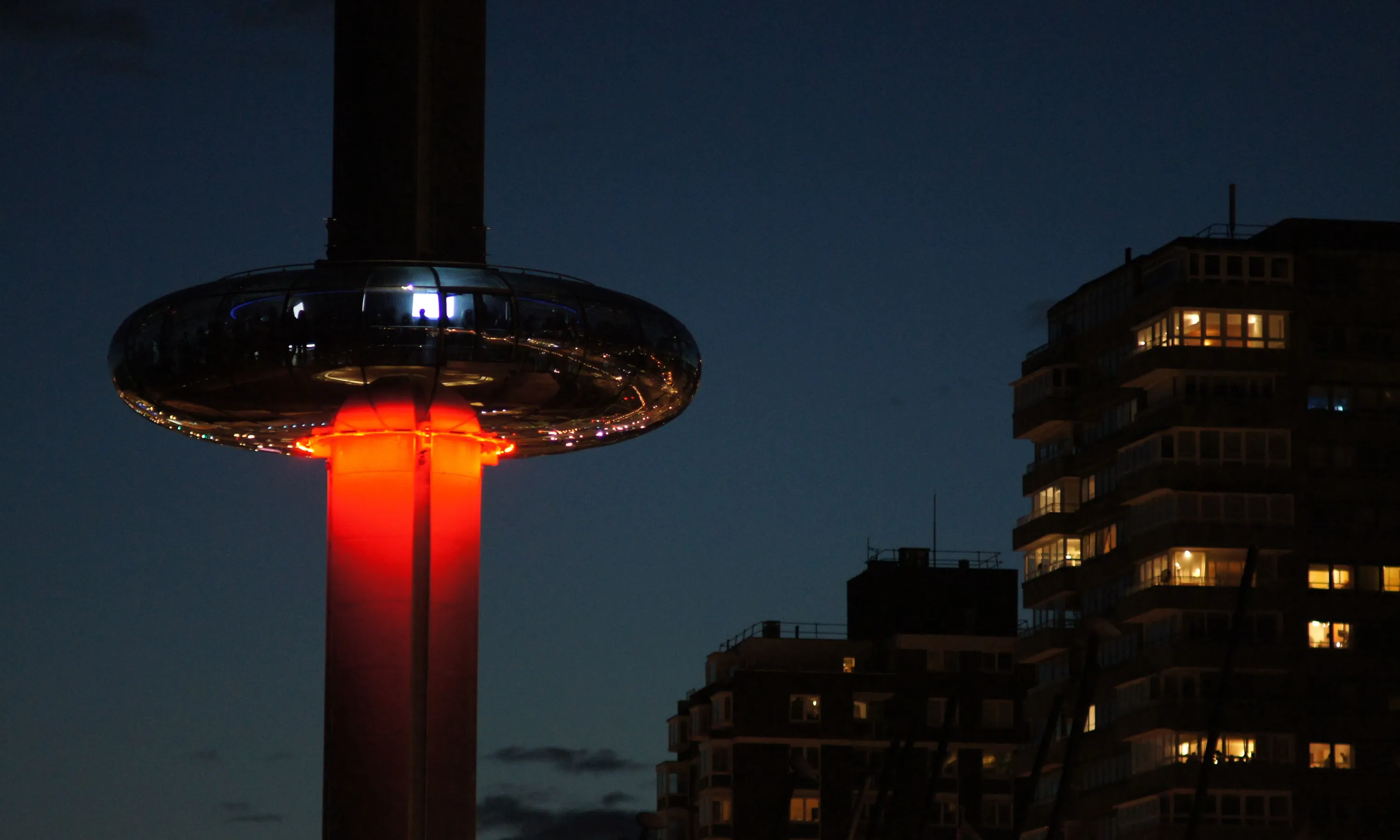 The British Airways i360 vertical cable car carries passengers to the top of the tower on its first day open to the public in Brighton, UK on August 5, 2016. The 90-tonne pod is made of 24 segments of handmade glass, holds up to 200 people and can rise up to 137 metres in front of the city’s West Pier. (Photo by Haydn West/Rex Features/Shutterstock)