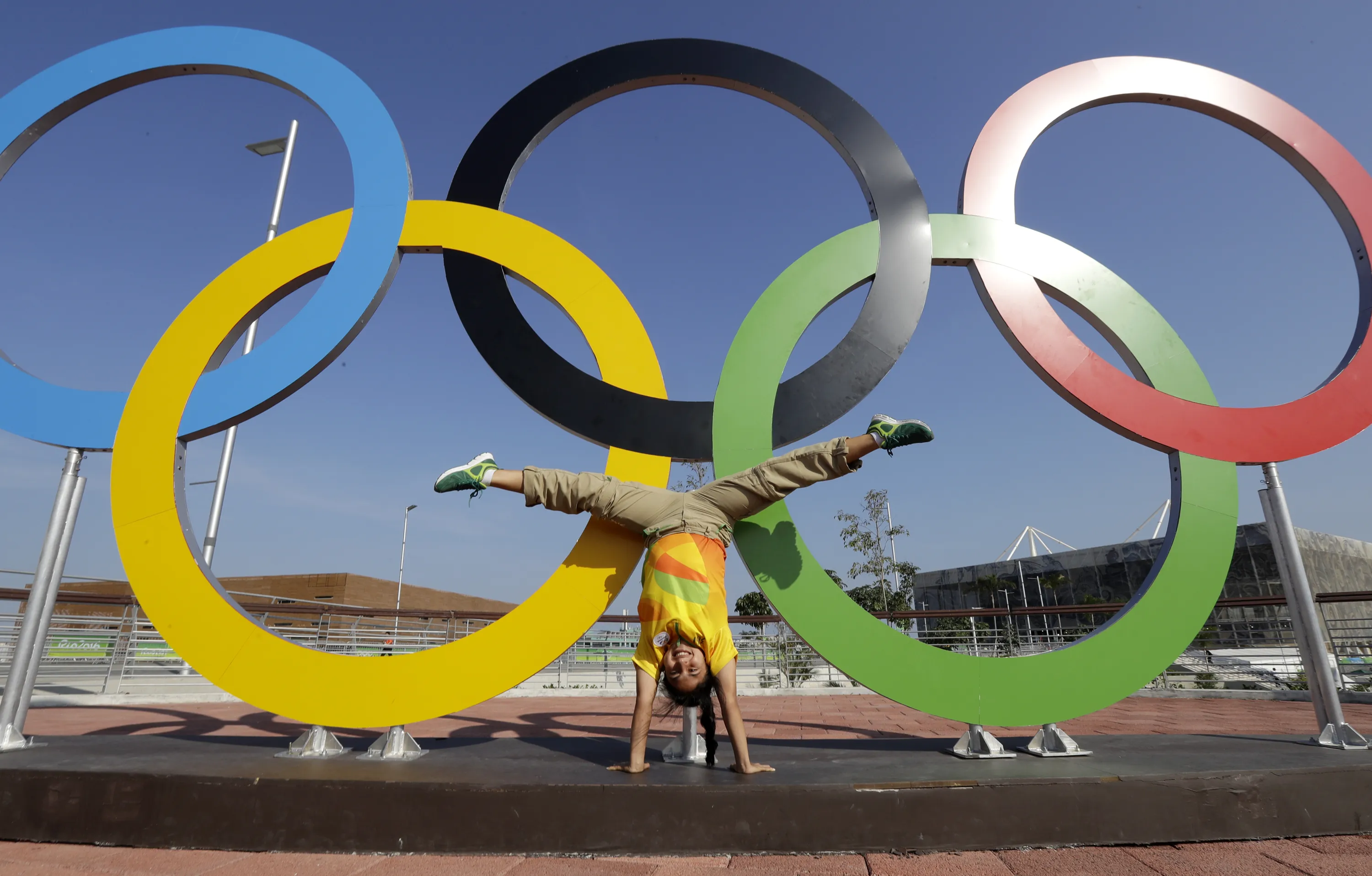 Leidy Romero Alarcon, of Colombia, does a hand stand while posing for a photograph in front of the Olympic Rings at the Olympic Park ahead of the 2016 Summer Olympics in Rio de Janeiro, Brazil, Friday, August 5, 2016. (Photo by Julio Cortez/AP Photo)