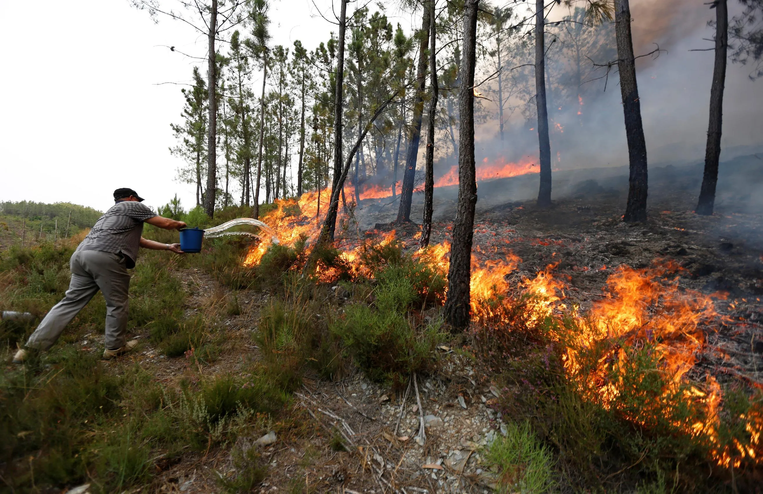The owner of a farm fights against the active front of a forest fire near Agueda, Portugal August 12, 2016. (Photo by Rafael Marchante/Reuters)