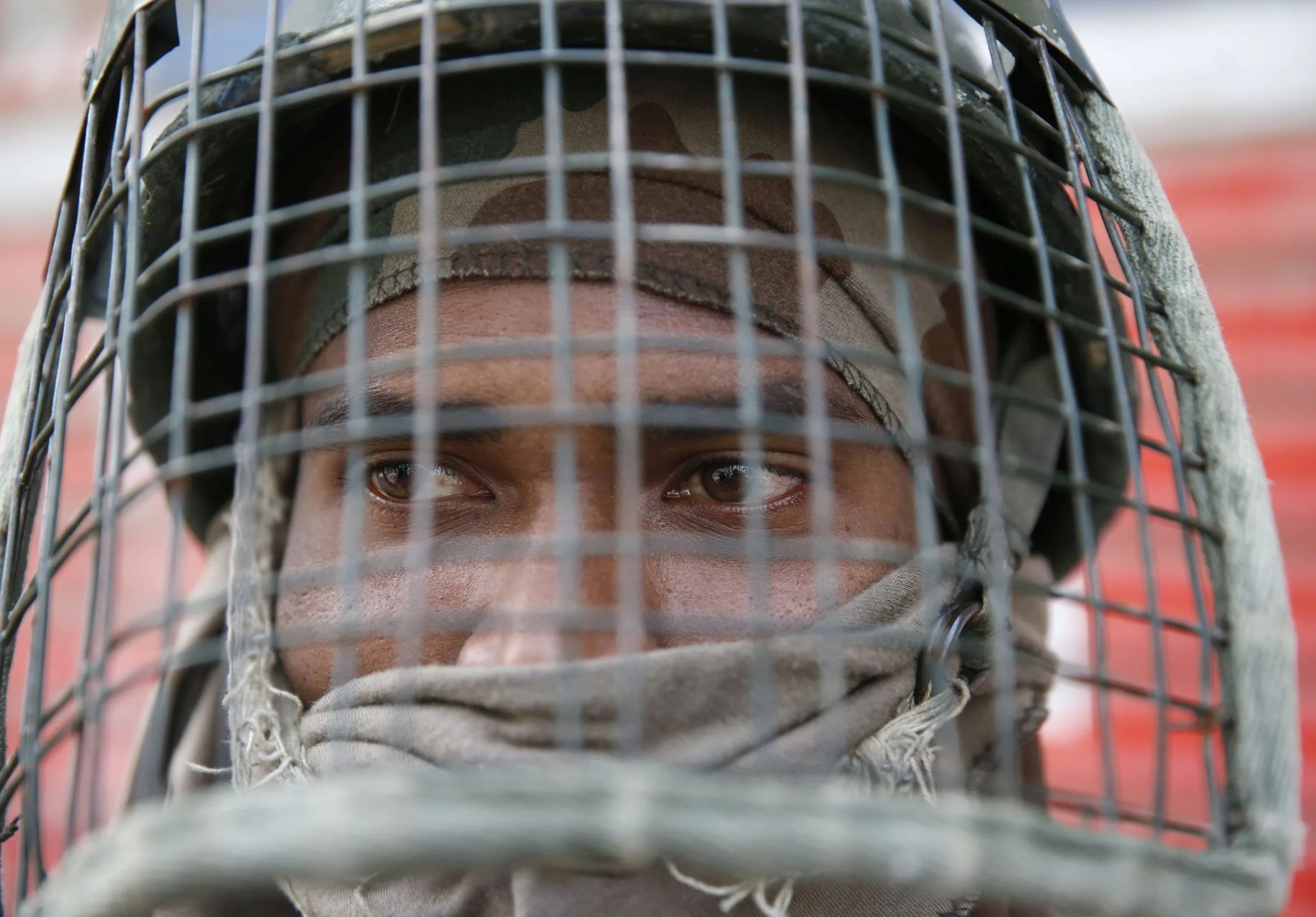 An Indian paramilitary soldier stands guard during a curfew in the Batamaloo area of Srinagar, the summer capital of Indian Kashmir, India, 12 August 2016. According local news reports, curfew, restrictions and curbs continued amid shutdown called by the unified separatist leaders as life remained paralyzed in Kashmir for the 35th consecutive day on 12 August. Over 55 persons have been killed and more than 7,000, including police and forces personnel, have been injured during the past 34 days following protests over the killing of Hizb-ul-Mujahideen commander, Burhan Muzaffar Wani and his two associates in a gunfight on 08 July 2016. (Photo by Farooq Khan/EPA)