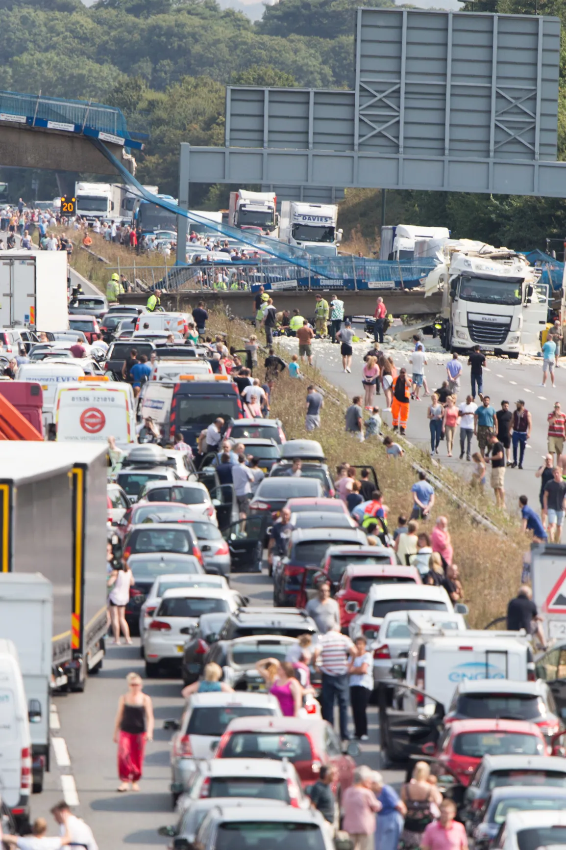 A footbridge collapses onto motorway traffic on the M20 in Kent this afternoon. It is believed a digger struck the bridge causing it to fall onto a lorry and other traffic. Air ambulance now on the scene. Featuring: m20, kent, bridge, collapse Where: Near Maidstone, United Kingdom When: 27 Aug 2016 Credit: WENN.com