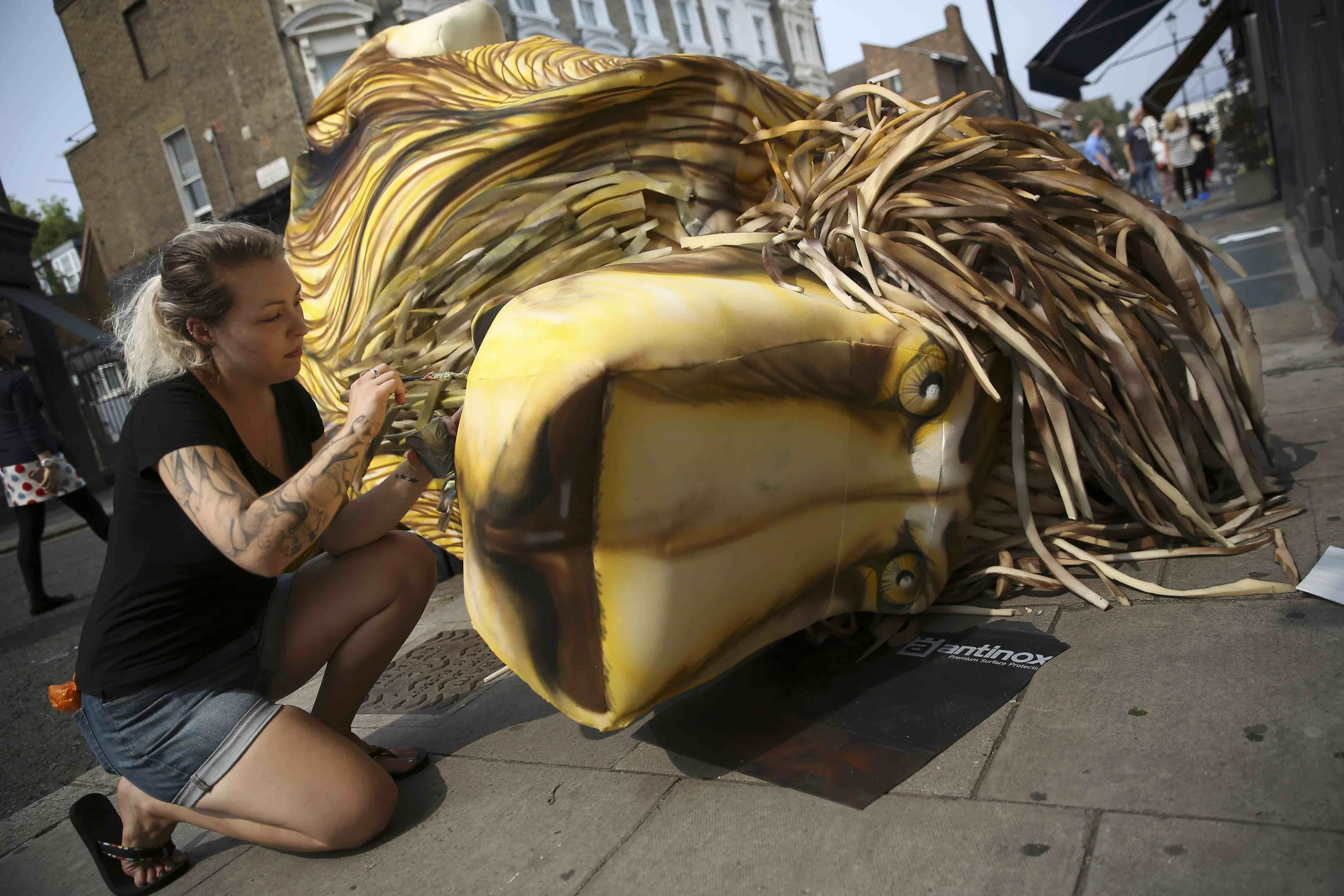 A woman decorates a lion head which will form a float at the Notting Hill Carnival in London, Britain August 27, 2016. (Photo by Neil Hall/Reuters)