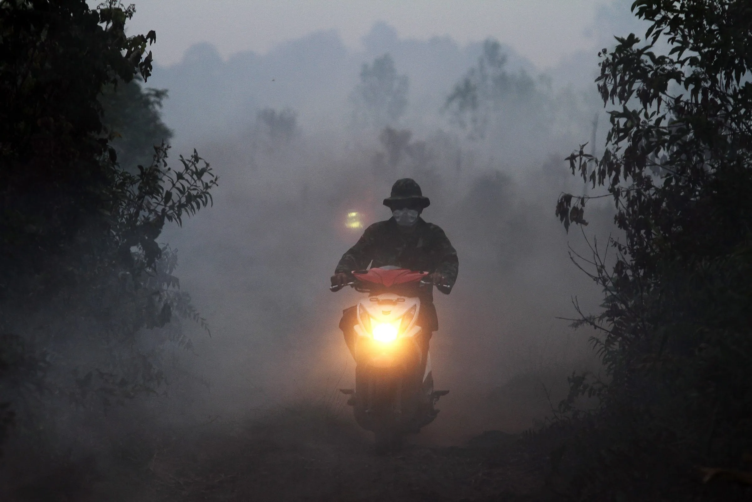 An Indonesian soldier rides a motorbike through thick smoke from burning land in Kampar, Riau province, Indonesia, 27 August 2016. According to media reports, thousands of firefighters have been sent in Riau province to control the land and forest fire. Indonesian authorities reported that they have arrested more than 450 people linked to forest fires that hit the country in previous years caused a cloud of toxic smoke which affected several countries in the region, local media reported 26 August 2016. The head of the National Police, Tito Karnavian, said the arrests serve as a deterrent against companies and farmers who start uncontrolled burning of agricultural production land for cleaning. (Photo by Rony Muharrman/EPA)