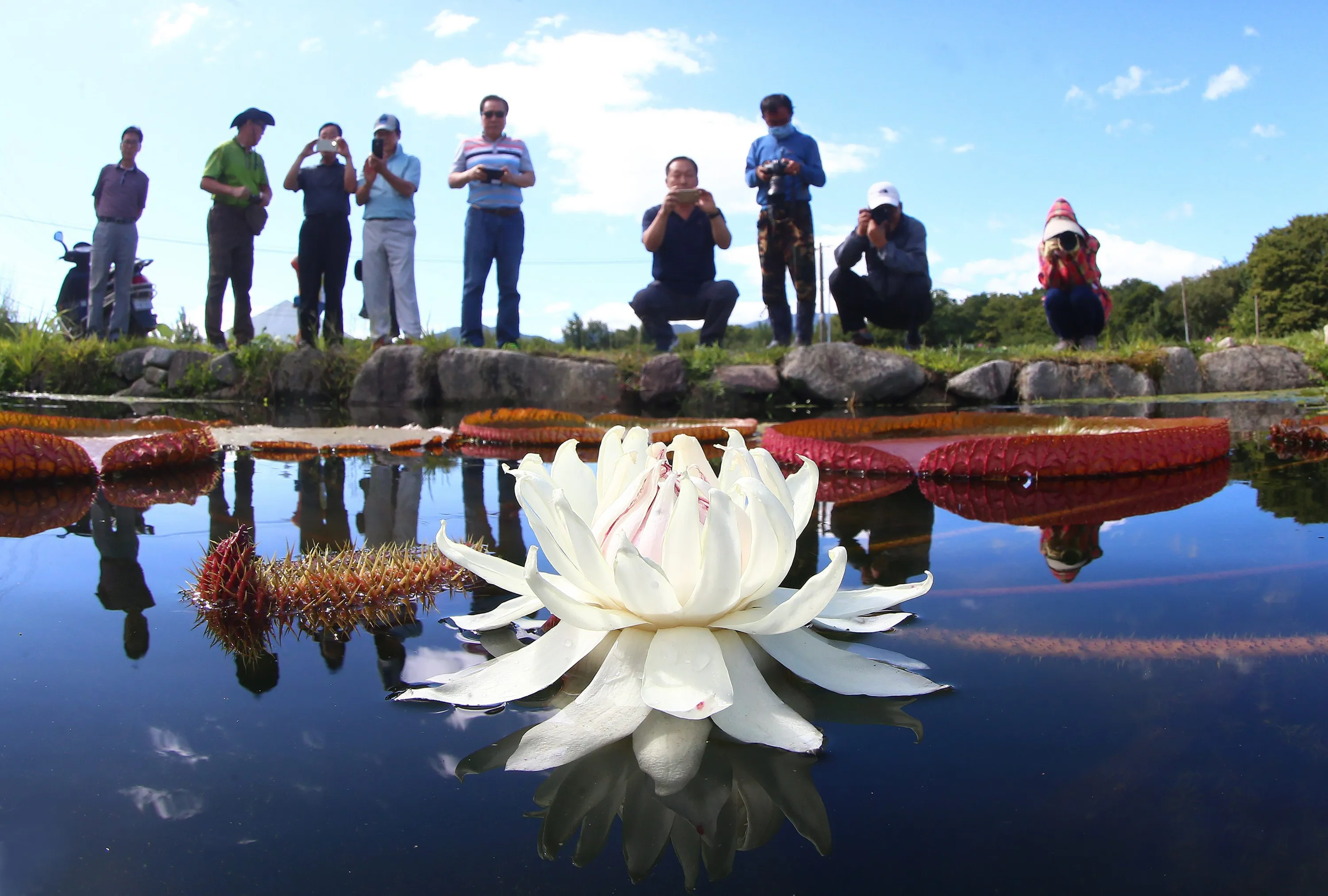 Tourists take pictures of a fully bloomed Victoria lotus (or Victoria amazonica) flower at a lotus garden in Hamyang, 330 kilometers south of Seoul, South Korea, 29 August 2016. The flowering plant is called “Queen of Night” as it blooms only at night. (Photo by EPA/Yonhap)