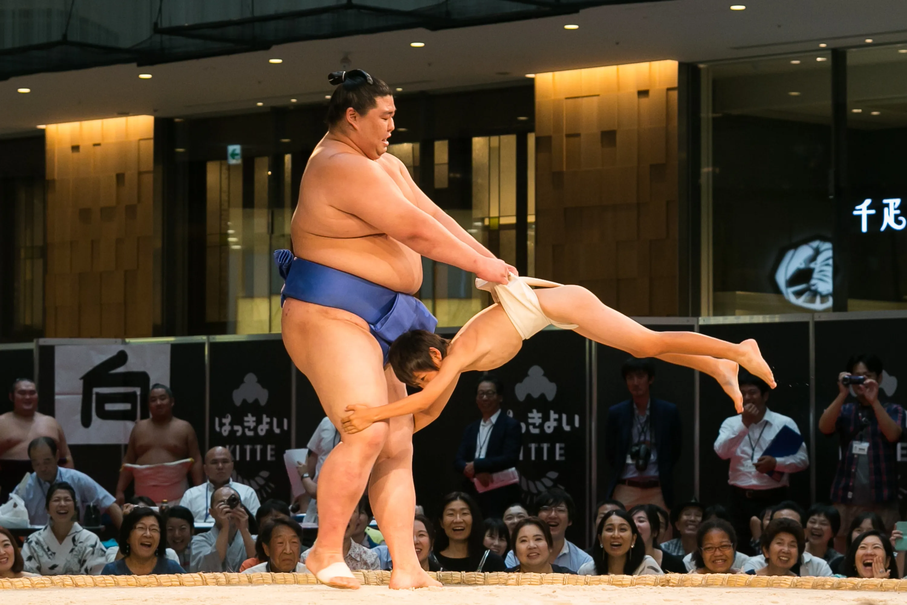 A sumo wrestler plays with a child during an exhibition before the start of a special grand sumo tournament in Tokyo, Japan on August 29, 2016. (Photo by Aflo/Barcroft Images)