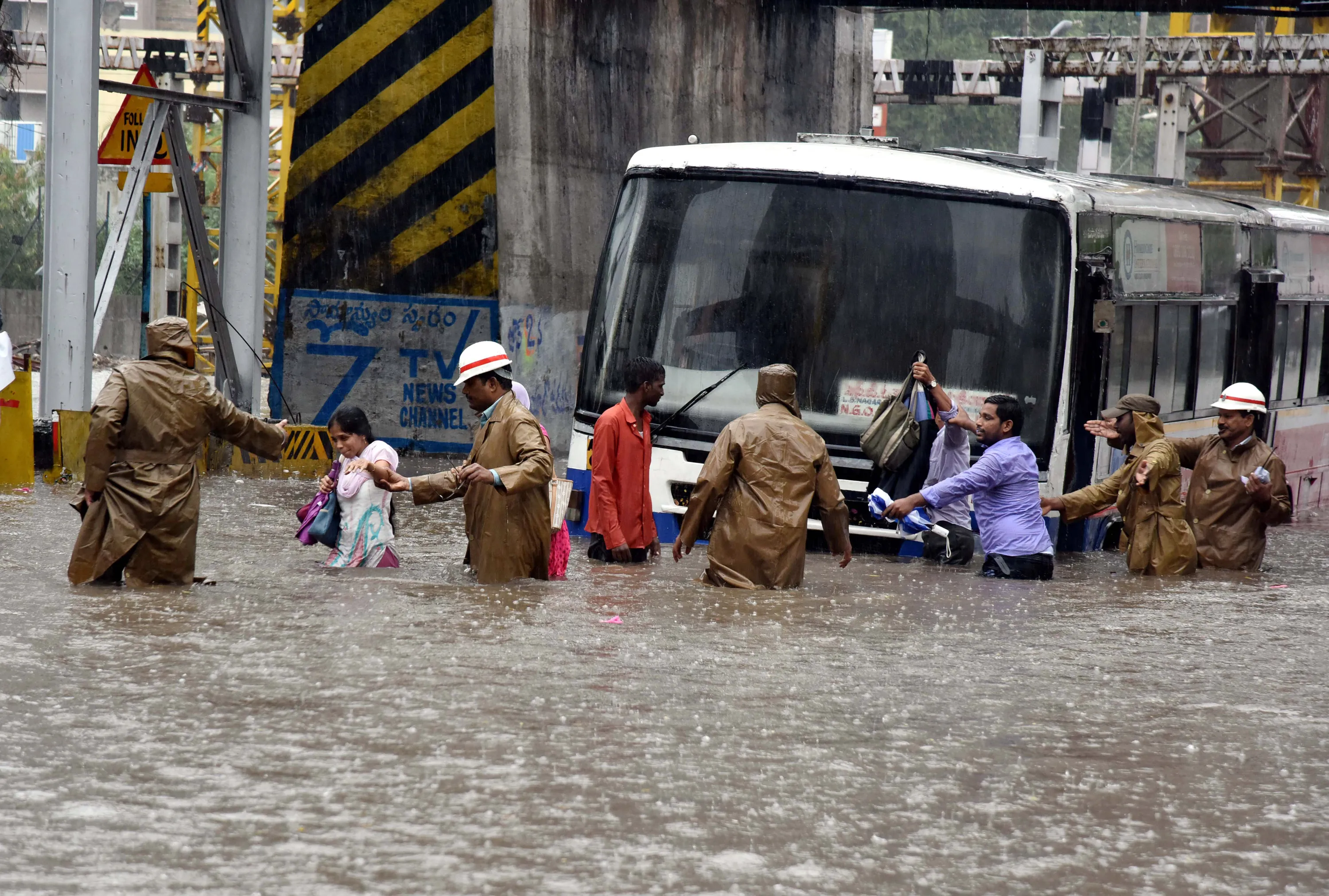 People wade through a flooded street after a heavy downpour lasting more than three hours in Hyderabad, India on September 1, 2016. (Photo by Xinhua/Barcroft Images)