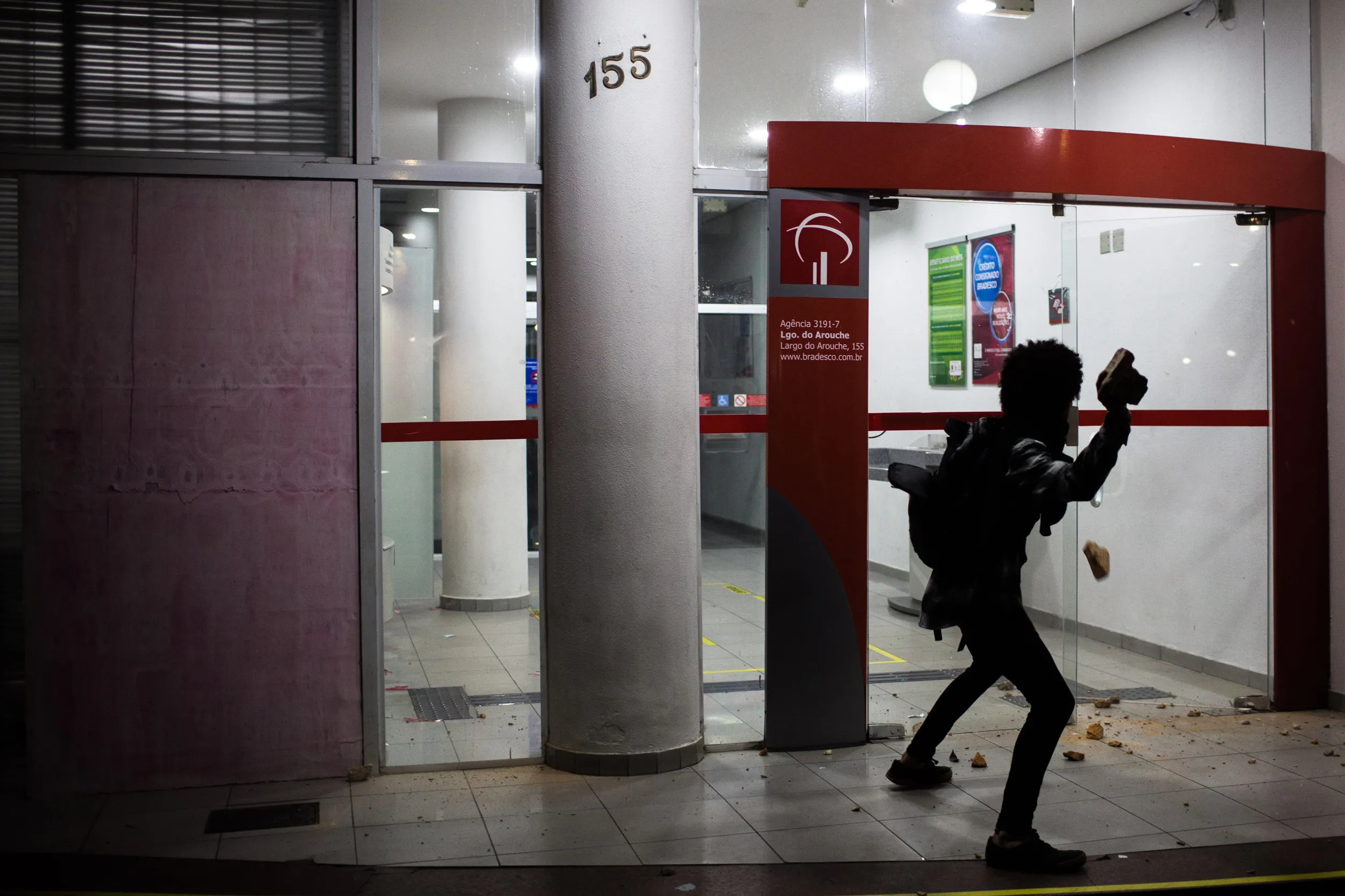 A protester in favor of former President Dilma Rousseff throws at a window during a protest march on August 31, 2016 in Sao Paulo, Brazil. Businesses were vandalized by protesters after Rousseff was impeached in a 61-to-20 Senate vote earlier in the day. (Photo by Victor Moriyama/Getty Images)