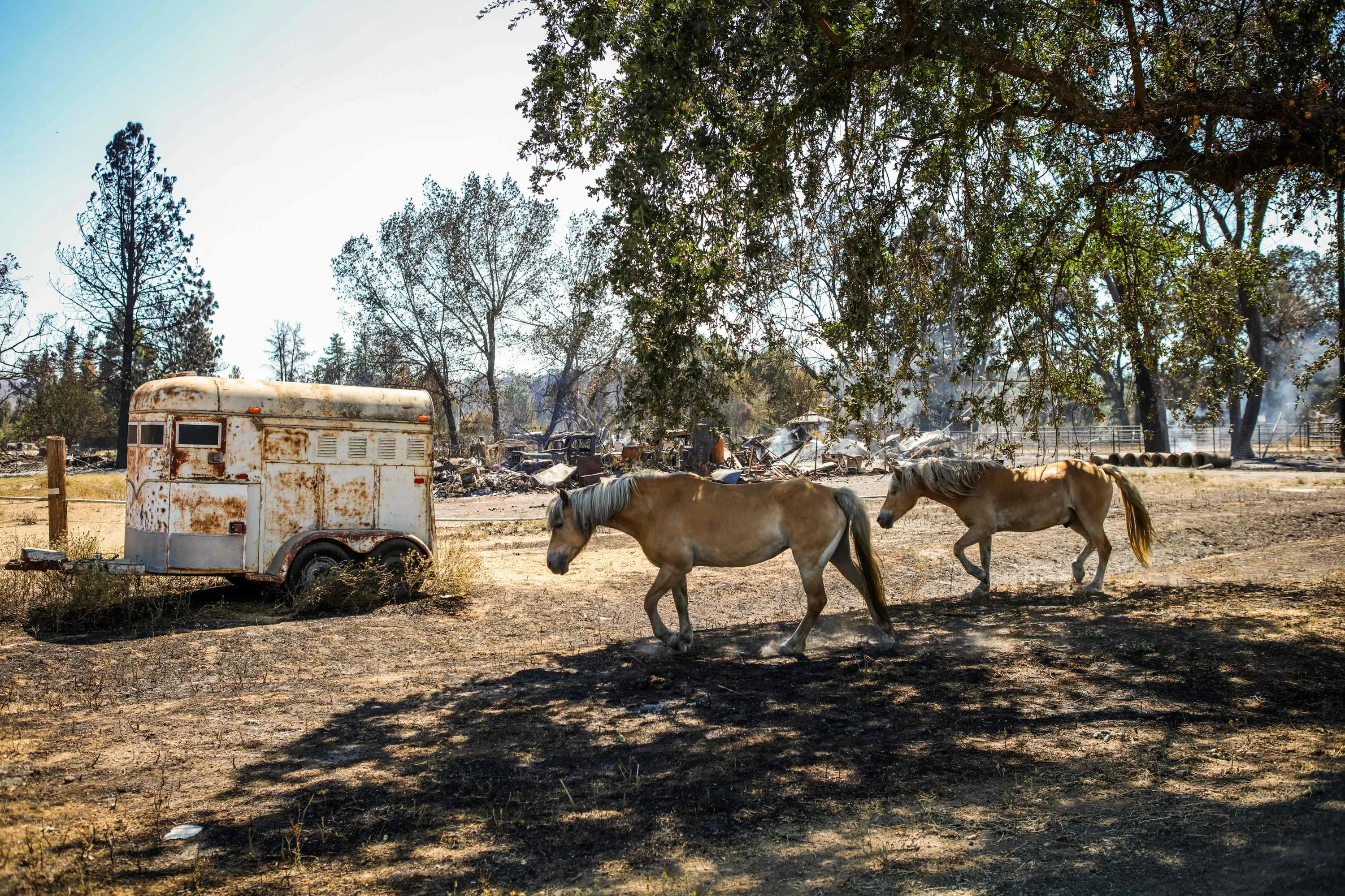 Horses walk past houses destroyed in the Clayton Fire in Lower Lake, California on August 15th, 2016. A northern California wildfire grew rapidly over the weekend, destroying homes and forcing 4,000 residents to flee, authorities said. (Photo by Gabrielle Lurie/AFP Photo)
