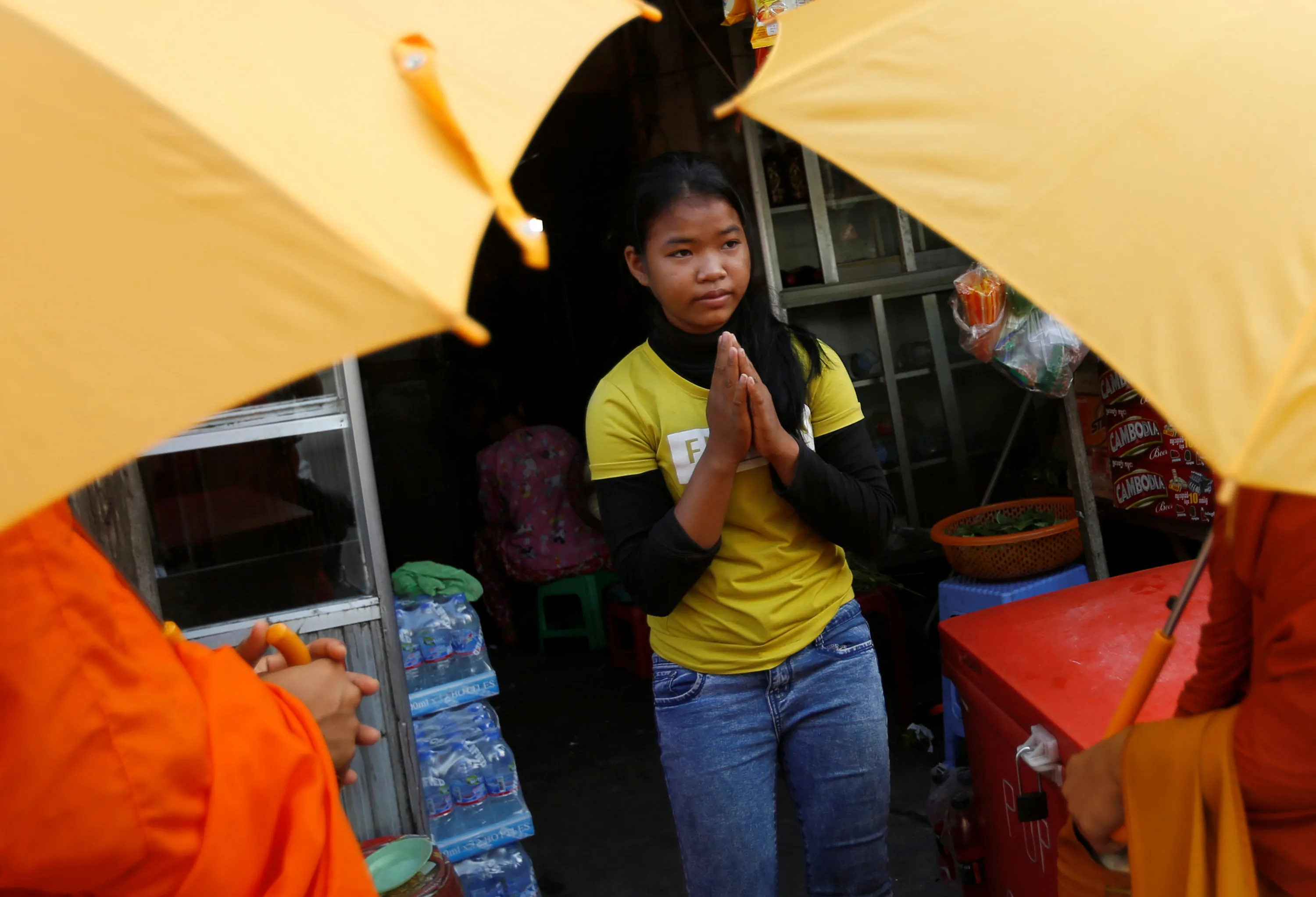 A girl prays as she offers some food to Buddhist monks along a street in Phnom Penh, Cambodia, September 6, 2016. (Photo by Samrang Pring/Reuters)