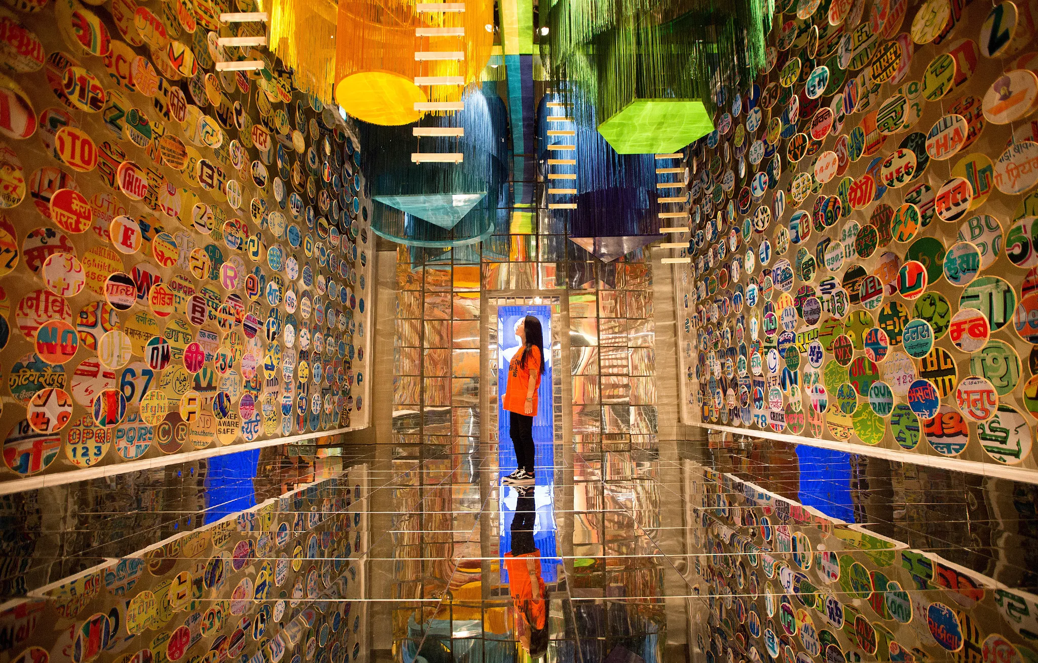 An employee poses for a photograph as she looks on at the Chakraview installation, designed by Sumant Jayakrishnan, representing India, during a preview of the London Design Biennale at Somerset House in London, U.K., on Tuesday, September 6, 2016. Over 30 countries and territories have newly commissioned works in the exhibition, that runs from Sept. 7 to Sept. 27, that explore the theme “Utopia by Design”, according to the organizer's website. (Photo by Simon Dawson/Bloomberg)