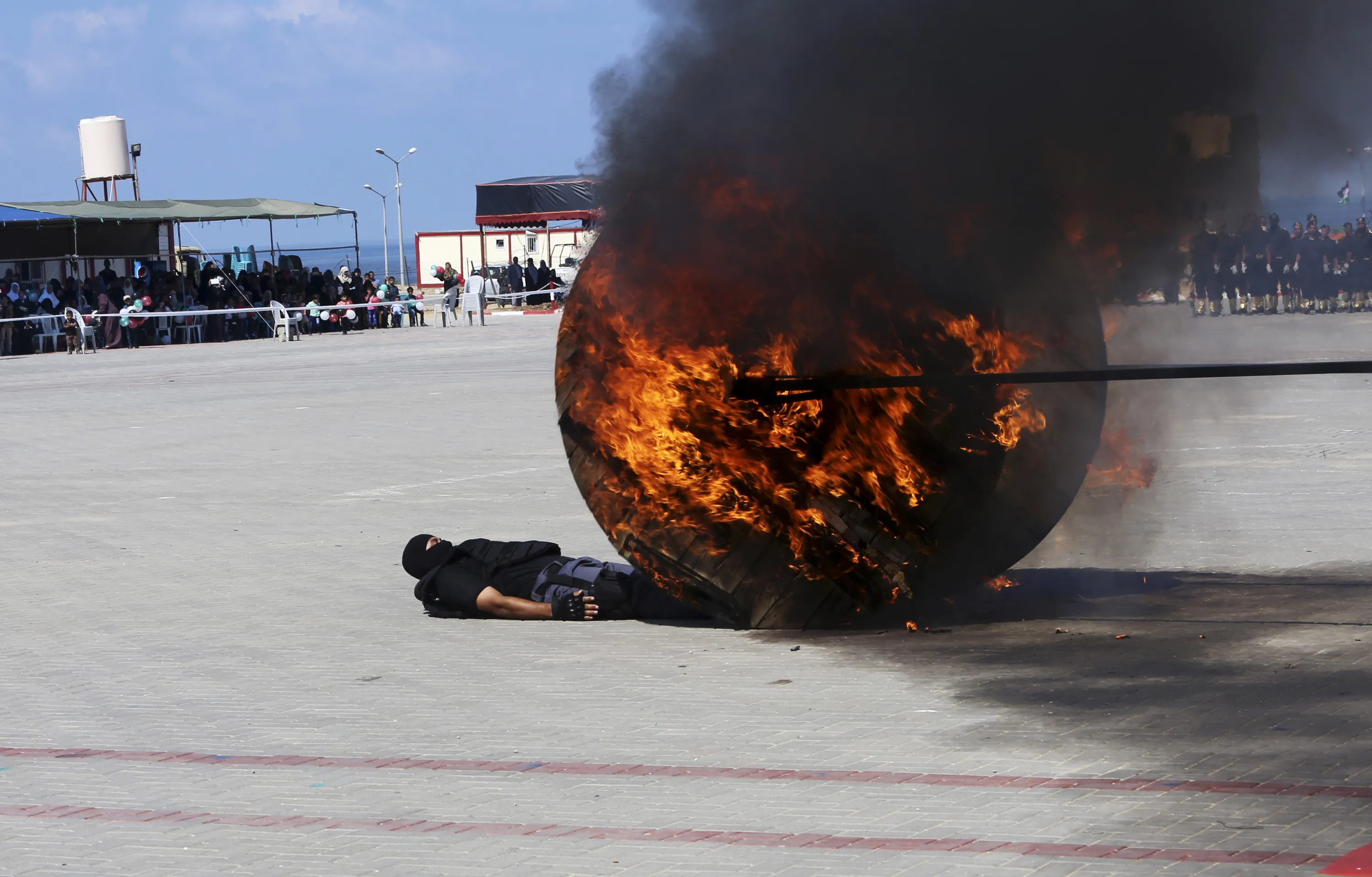 A Palestinian member of Hamas security force lies under a fired wood wheel, while displaying his military skills during a police academy graduation ceremony in Gaza City, Tuesday, September 6, 2016. (Photo by Adel Hana/AP Photo)