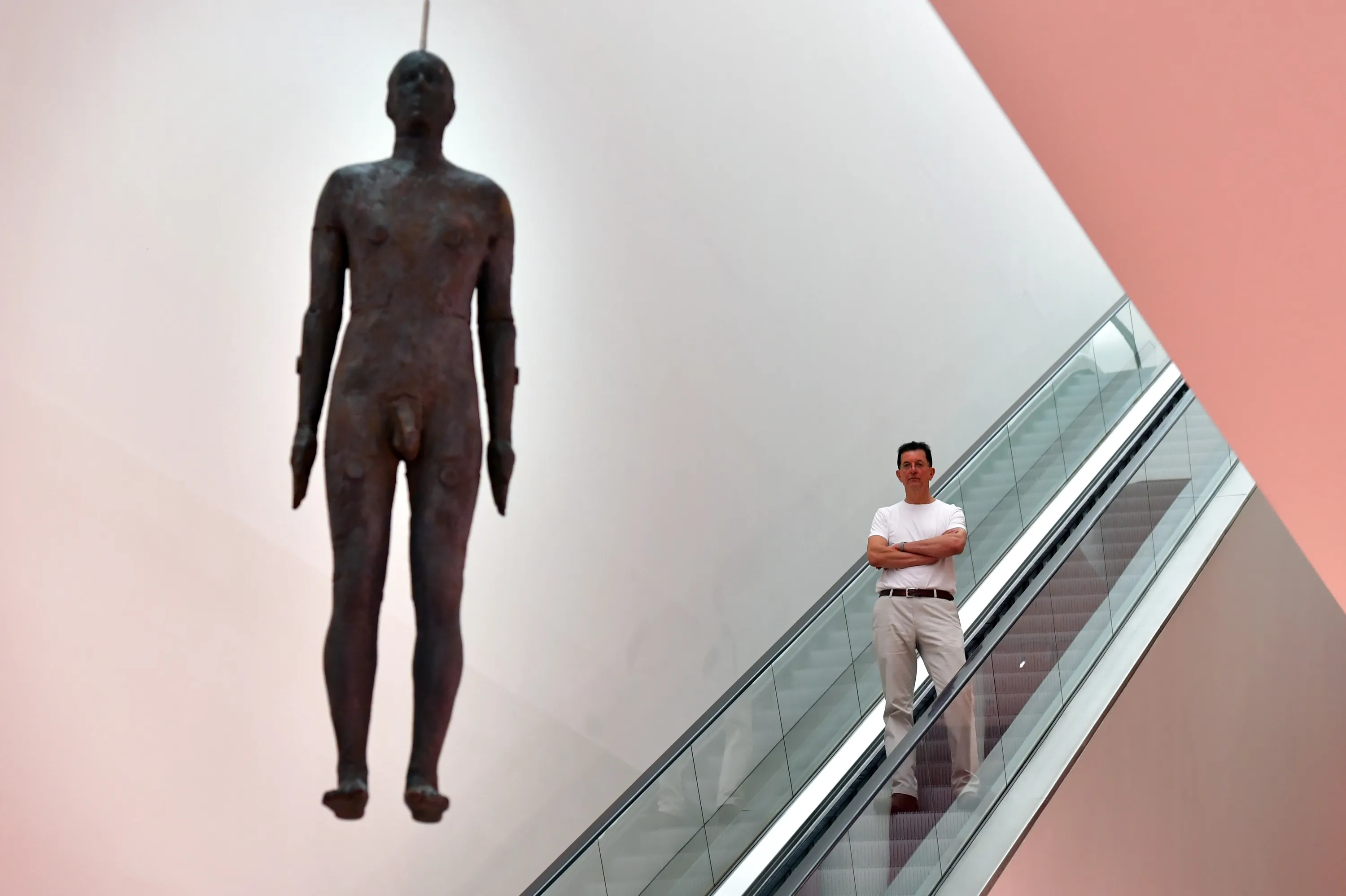 British artist Antony Gormley poses for a photograph next to his artwork entitled “Object, 1999”, a life-size cast-iron sculpture cast from the artist's body and hung from the ceiling of the National Portrait Gallery, during a press preview on September 7, 2016 in London, England. The work is accompanied on October 5 by “Fall, 1999”, a selection of drawings also by Mr Gormley. (Photo by Carl Court/Getty Images)