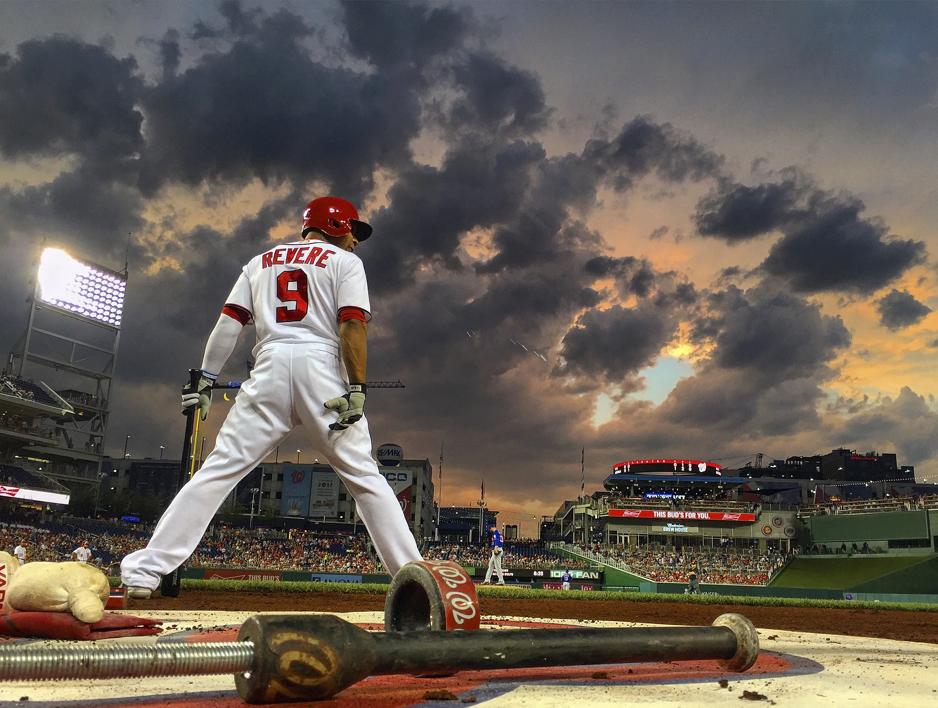 Washington's Ben Revere (9) stands on deck as storm clouds gather that lead to a mid game rain delay as the Washington Nationals play the New York Mets at Nationals Park in Washington DC, June 28, 2016. (Photo by John McDonnell/The Washington Post)