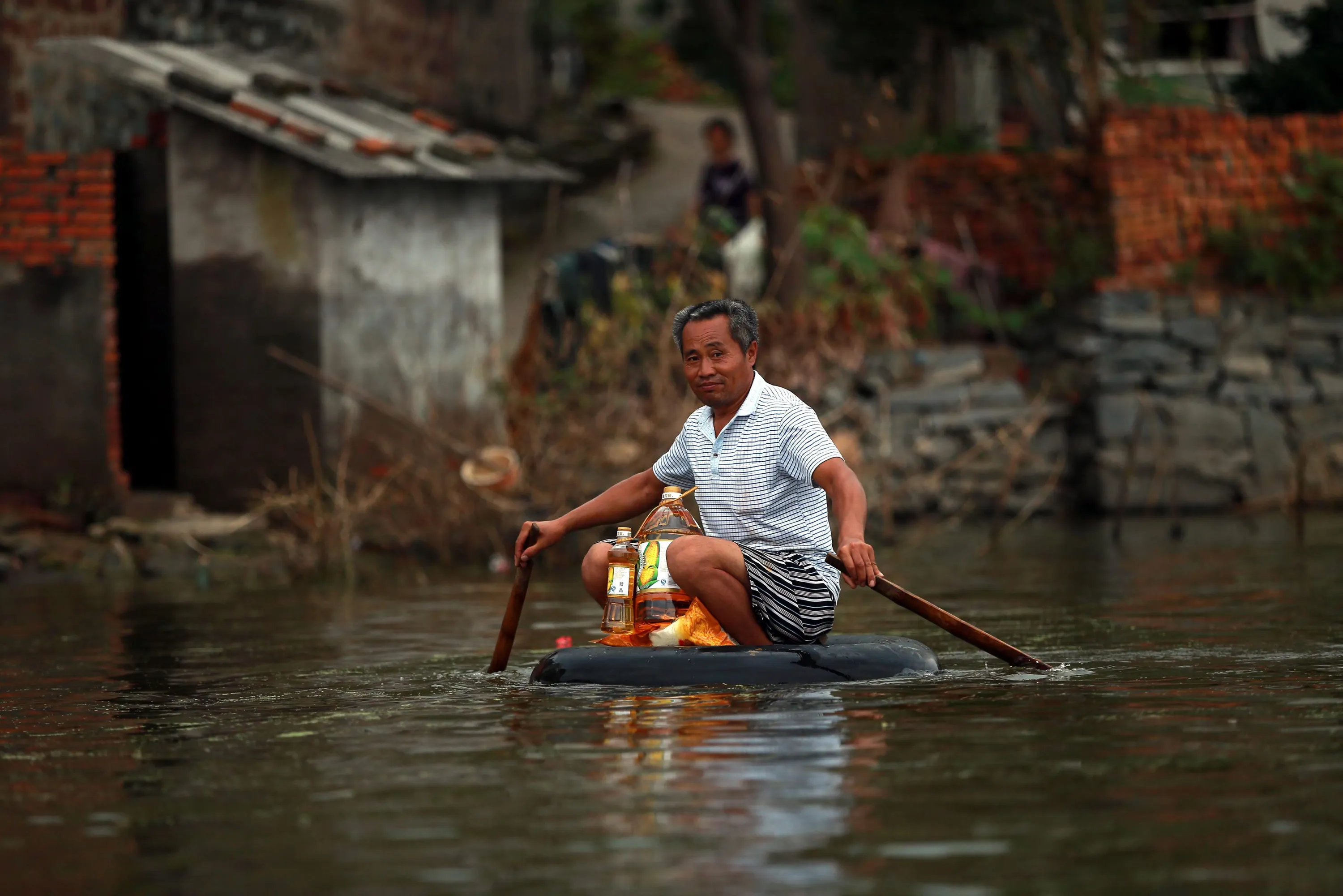 A picture made available on 23 July 2016 of a man paddling in a makeshift boat on flood water, Xinhua Village of Xinchang county in Wuhan city, Hubei Province of central China on 18 July 2016. (Photo by Mark/EPA)