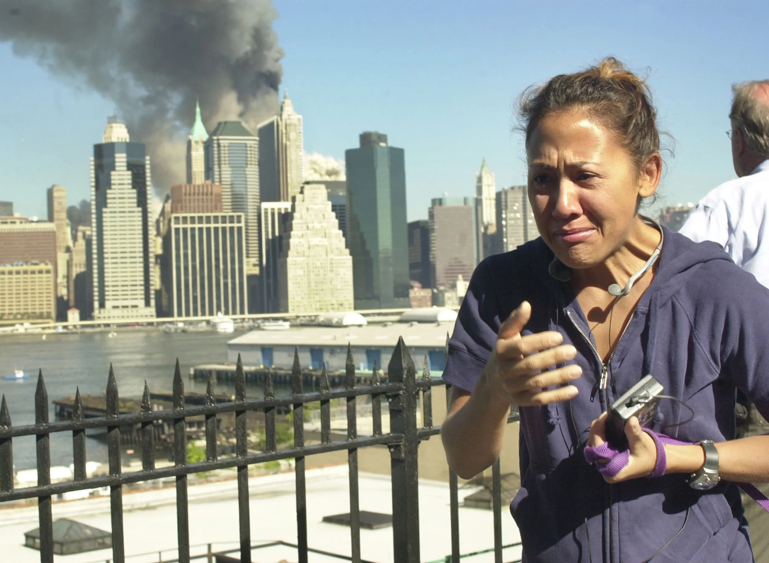 A woman reacts to a third explosion, possibly the collapse of the World Trade Center towers, while observing from the Brooklyn Promenade, which provides a view of the Manhattan skyline, Tuesday, September 11, 2001, in New York. (Photo by Kathy Willens/AP Photo)
