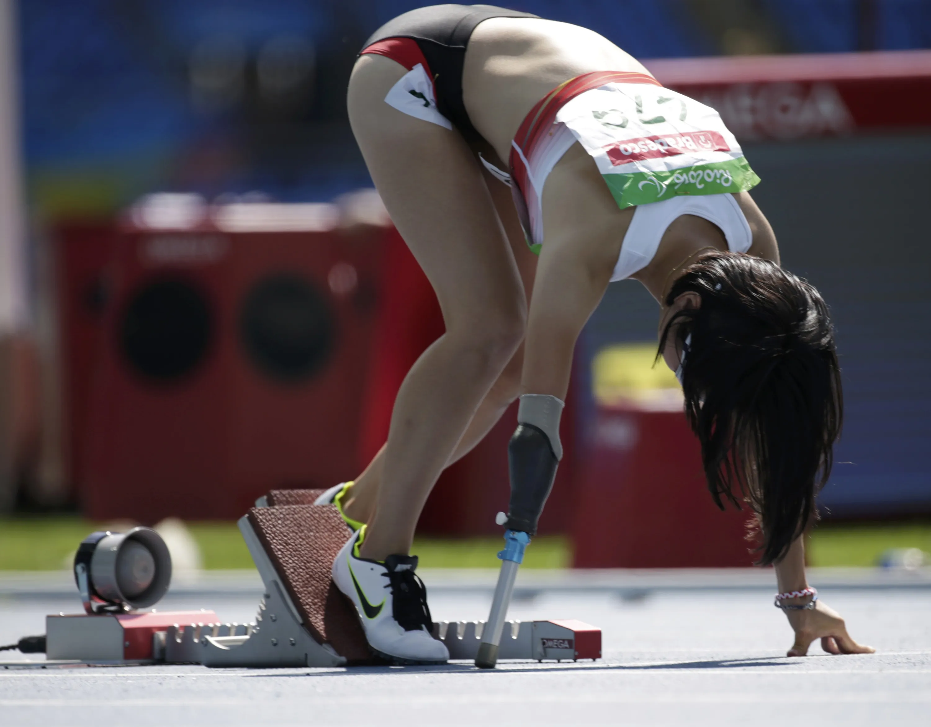 2016 Rio Paralympics, Athletics, Women's 400m, T47 Round 1 Heat 1, Olympic Stadium, Rio de Janeiro, Brazil on September 13, 2016. Saey Tsuji of Japan gets into the starting block. (Photo by Ricardo Moraes/Reuters)