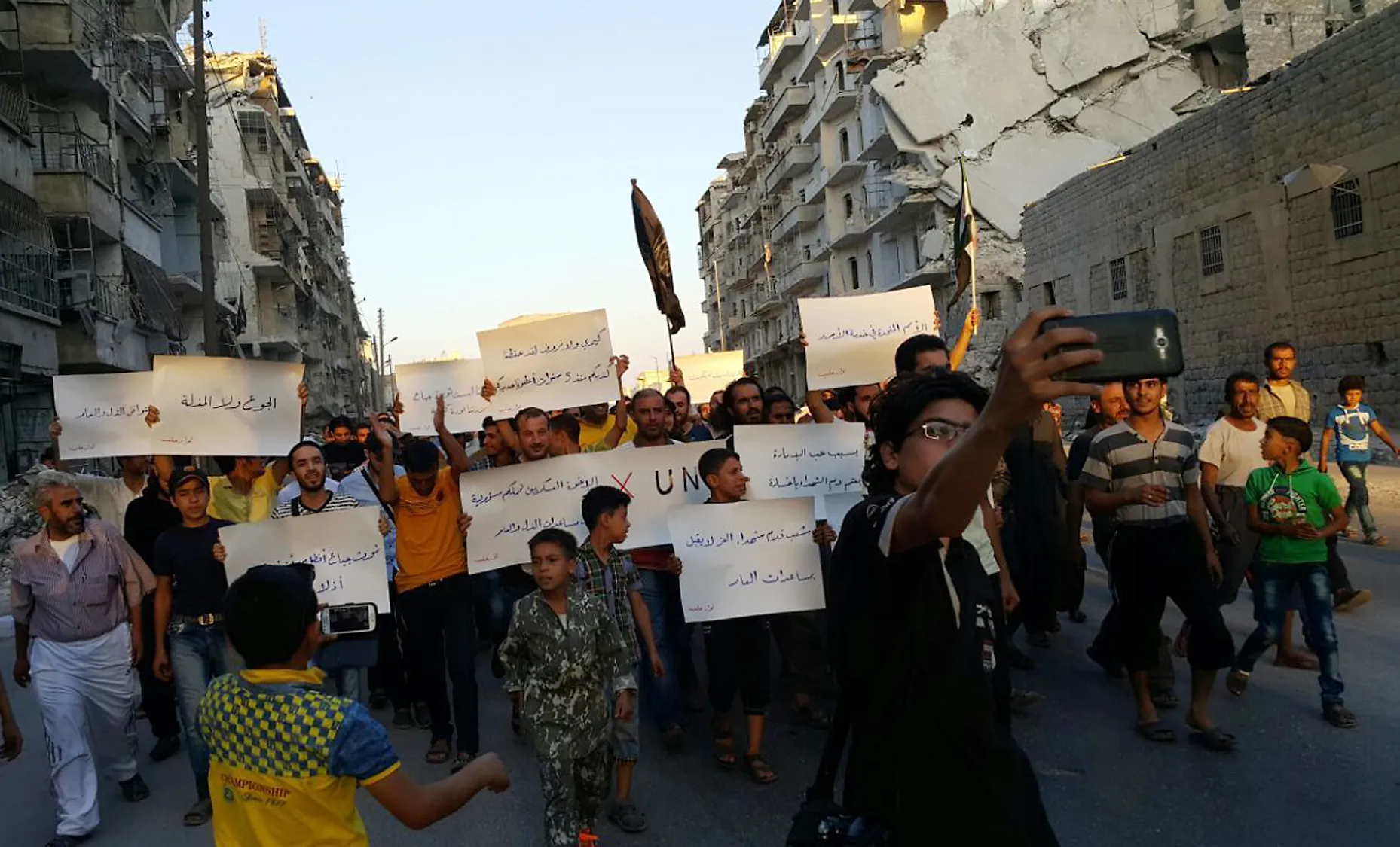 Activists in Syria’s besieged Aleppo protest against the United Nations for what they say is its failure to lift the siege off their rebel-held area, Tuesday, September 13, 2016. Dozens of protesters marched in al-Shaar neighborhood heading toward the Castello road, the area from which aid is expected to be delivered. “Hunger better than humiliation,” one banner read. “X the UN”, another read. (Photo by Modar Shekho via AP Photo)