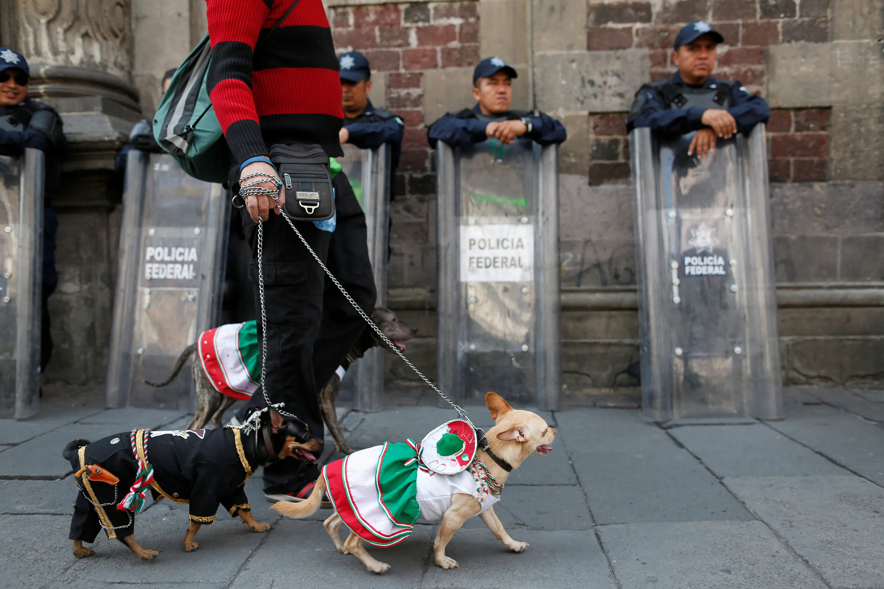 Dogs in traditional outfits walk in front of riot police near the Zocalo square, before the “Cry of Independence” ceremony to mark the 206th anniversary of the day rebel priest Manuel Hidalgo set the path to independence in Mexico City, Mexico September 15, 2016. (Photo by Carlos Jasso/Reuters)