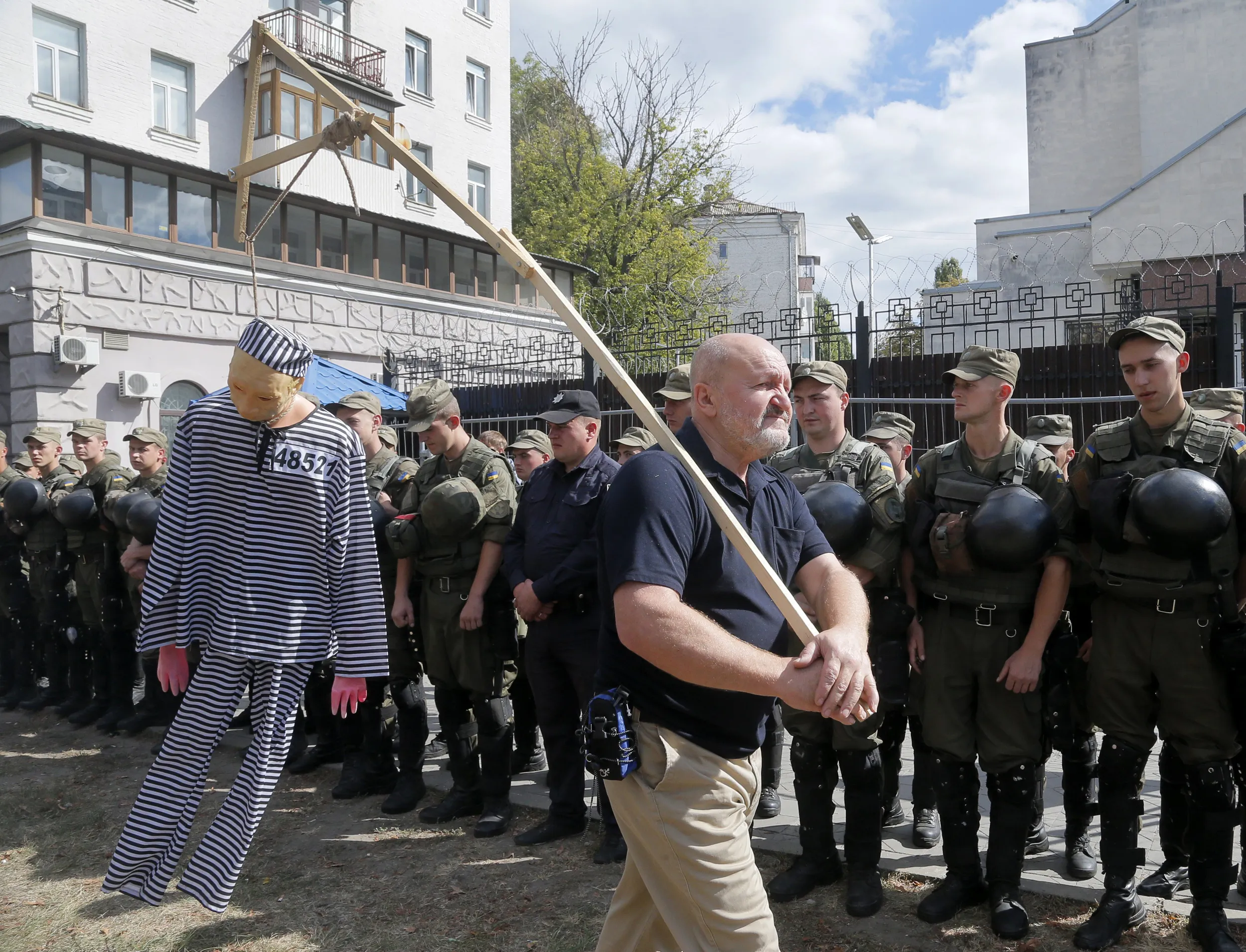 An activist holds a mock figure of Putin during a protest in front of the Russian Embassy, as Ukrainian servicemen and policemen stand guard in Kiev, Ukraine, Sunday, September18, 2016. A group of Ukrainian activists gathered in front of the Russian Embassy to protest against the Russian parliamentary elections in a polling station on the territory of the Russian Embassy. Russia's weekend parliament elections take place under new rules that in principle could bring genuine opposition into the national legislature. (Photo by Efrem Lukatsky/AP Photo)