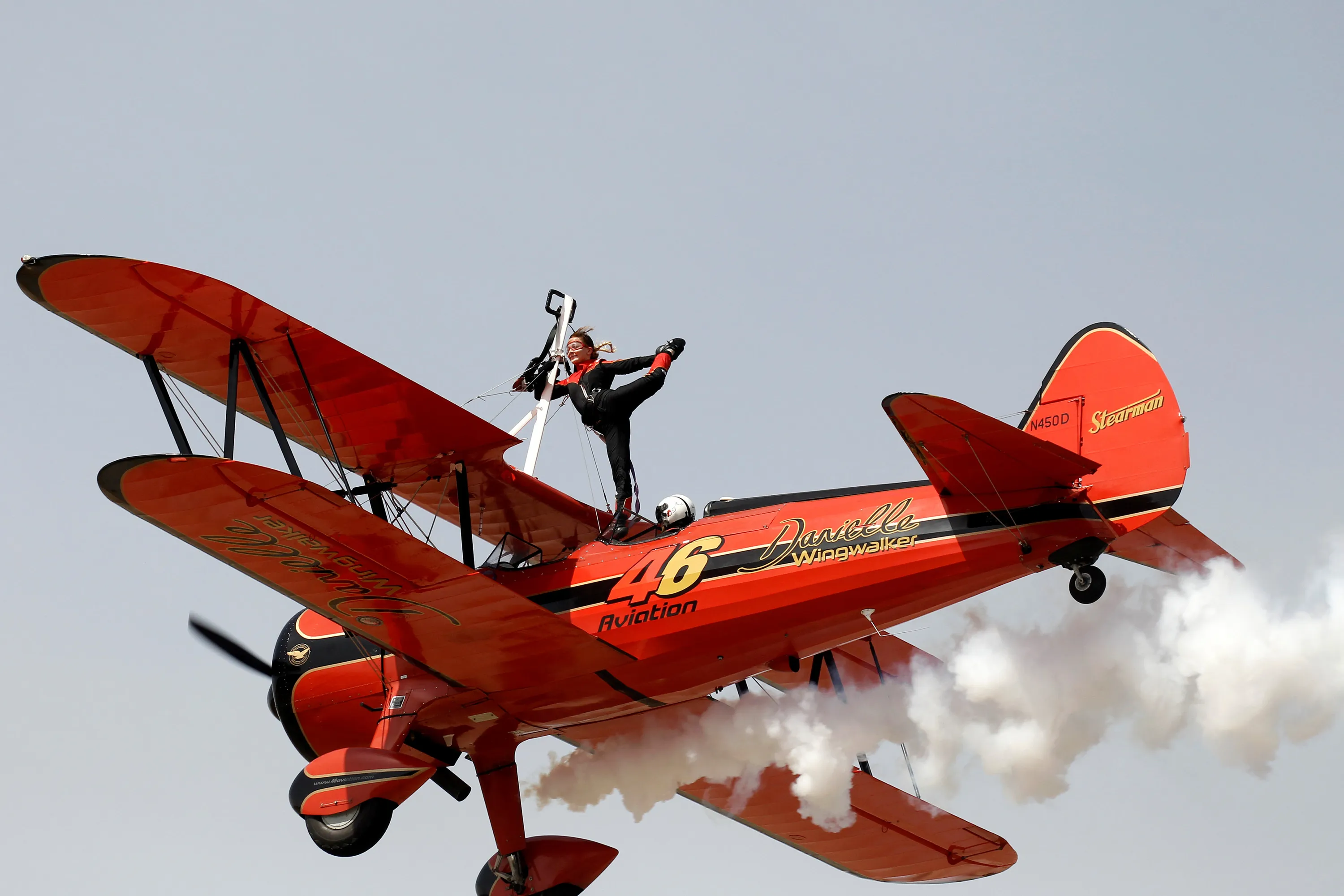 Danielle Hughes performs on a plane piloted by Emilliano Del Buono during the Athens Flying Week aviation event over the Tanagra air base in northern Athens, Greece, September 18, 2016. (Photo by Michalis Karagiannis/Reuters)