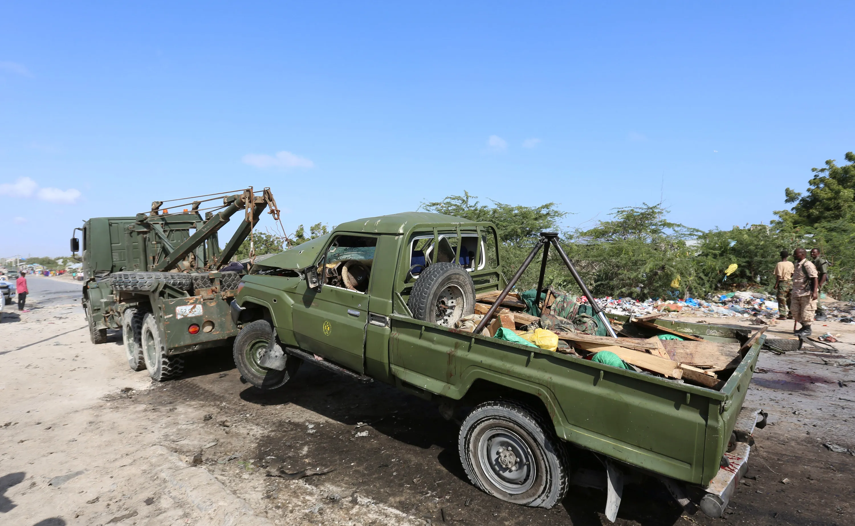 A Somali military vehicle tows a damaged car after it was rammed by a car bomb driven by an al Shabaab suicide attacker, in Somalia's capital Mogadishu, September 18, 2016. (Photo by Feisal Omar/Reuters)