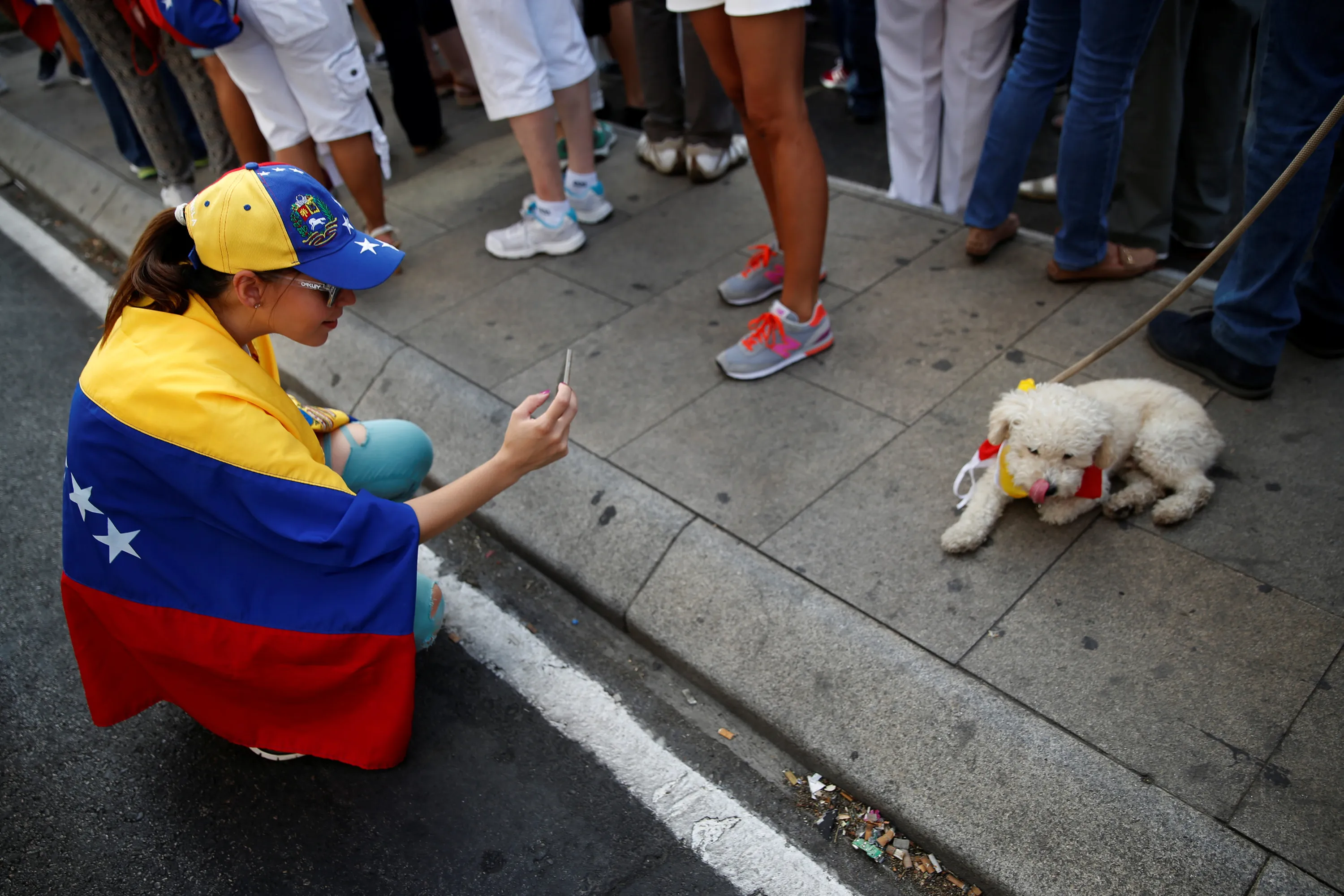 A protester takes pictures of a dog wearing the Venezuelan flag around his neck during a demonstration to demand a referendum to remove Venezuela's President Nicolas Maduro, in Madrid, Spain, September 4, 2016. (Photo by Susana Vera/Reuters)