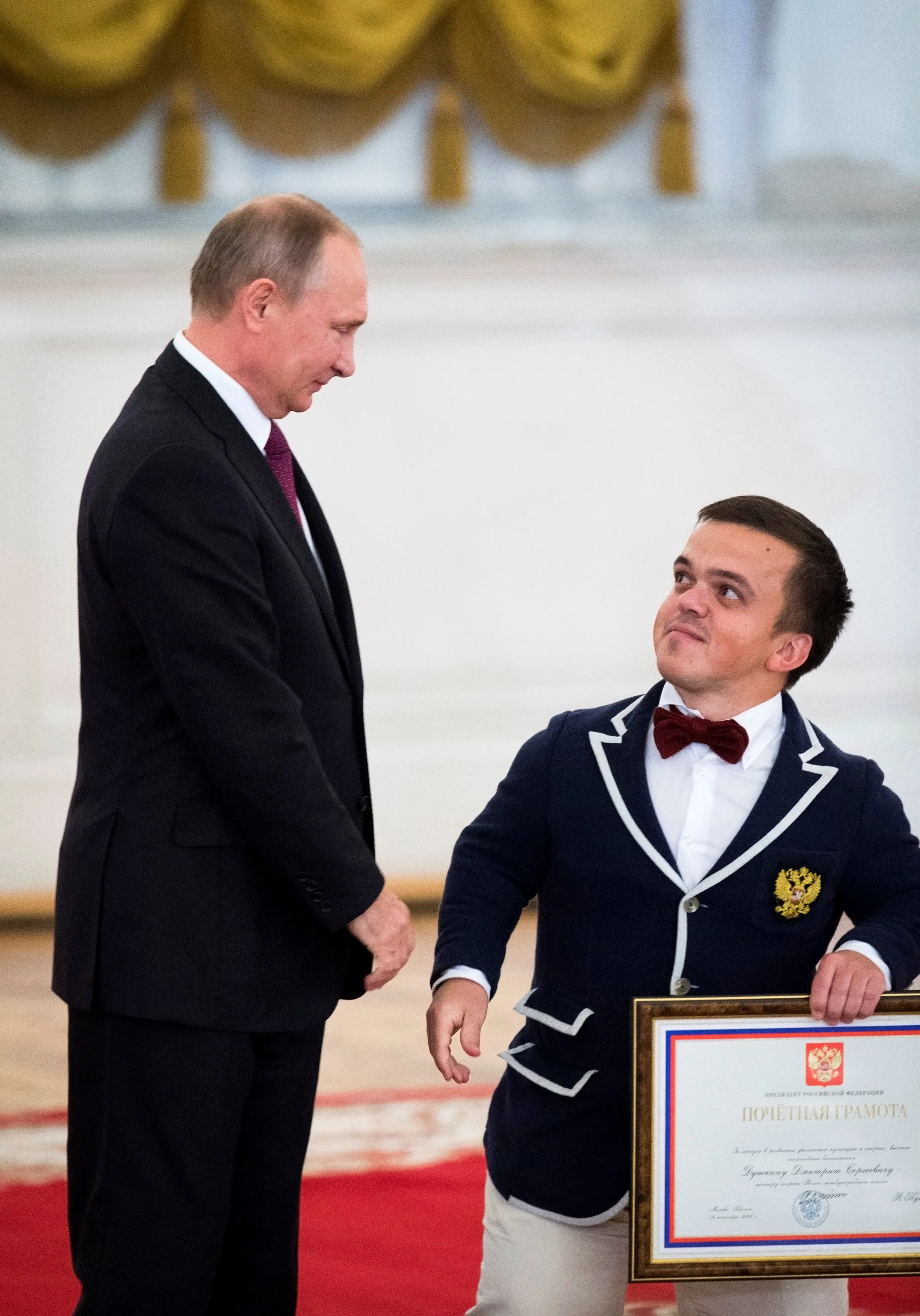 Russian President Vladimir Putin meets Dmitry Dushkin, member of the Russian summer sports Paralympic team in the men's shot put discipline, at the Kremlin in Moscow, Russia September 19, 2016. (Photo by Ivan Sekretarev/Reuters)