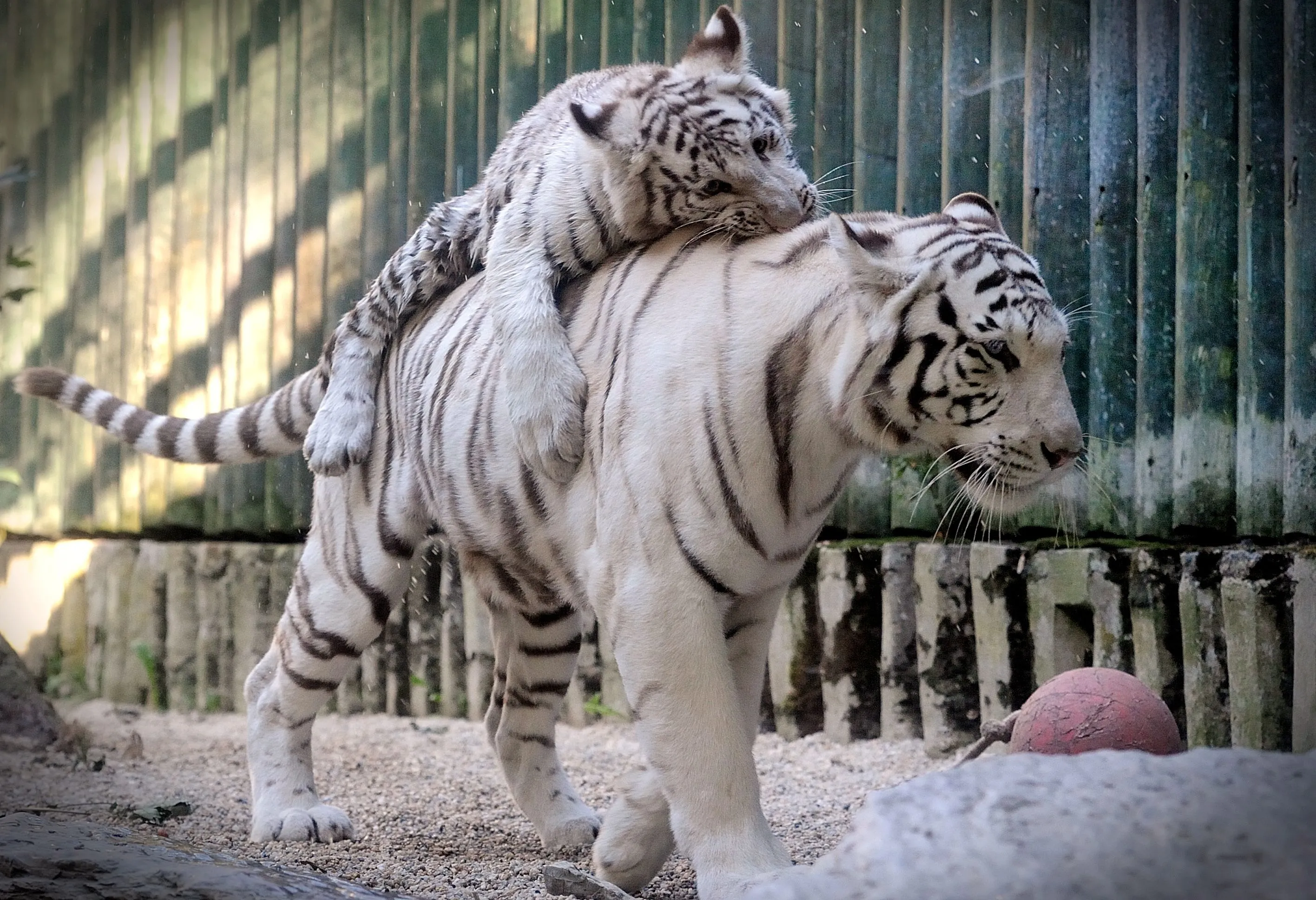 A white Indian tiger cub plays with its mother at Liberec Zoo in Liberec, Czech Republic on September 20, 2016. (Photo by Slavek Ruta/Rex Features/Shutterstock)