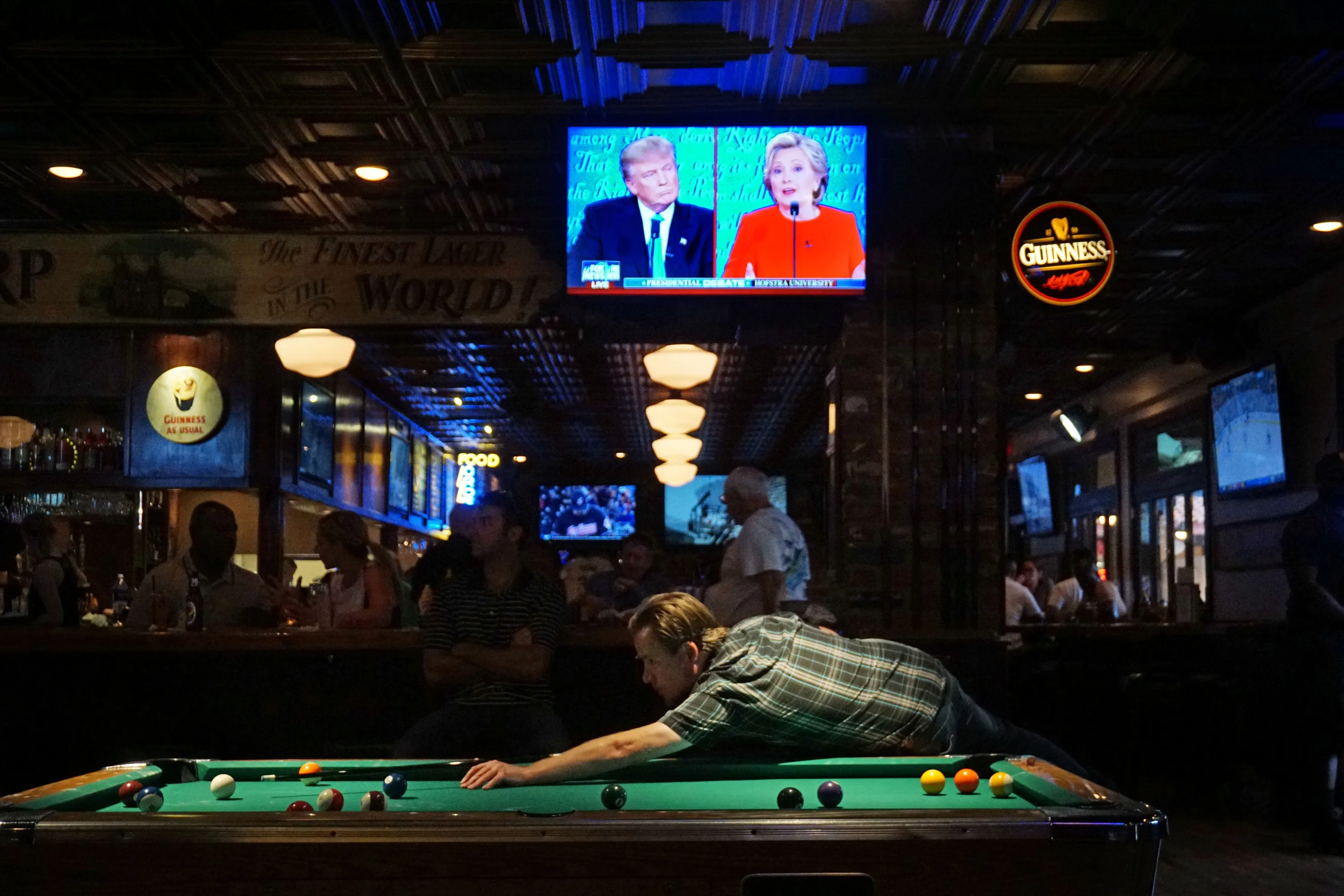 Patrons at McGregor's Bar and Grill watch the first televised debate between Democratic presidential candidate Hillary Clinton and Republican presidential candidate Donald Trump in San Diego, California, U.S. September 26, 2016. (Photo by Sandy Huffaker/Reuters)