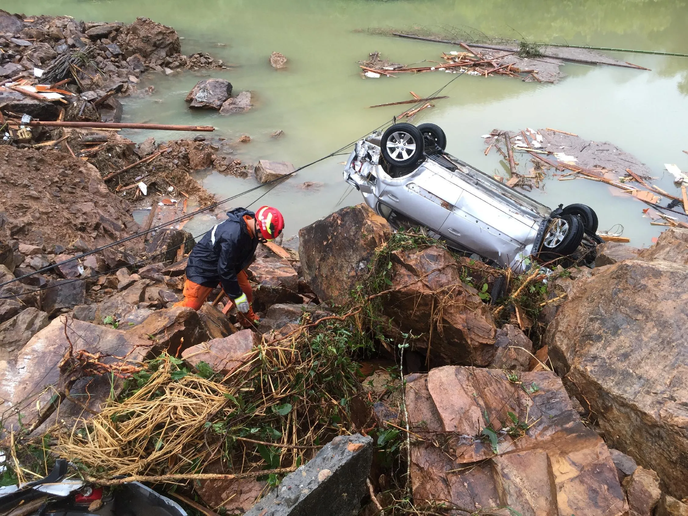 A rescue worker is seen next to an overturned car at the site of a landslide caused by heavy rains brought by Typhoon Megi, in Sucun Village, Lishui, Zhejiang province, China, September 29, 2016. (Photo by Reuters/Stringer)