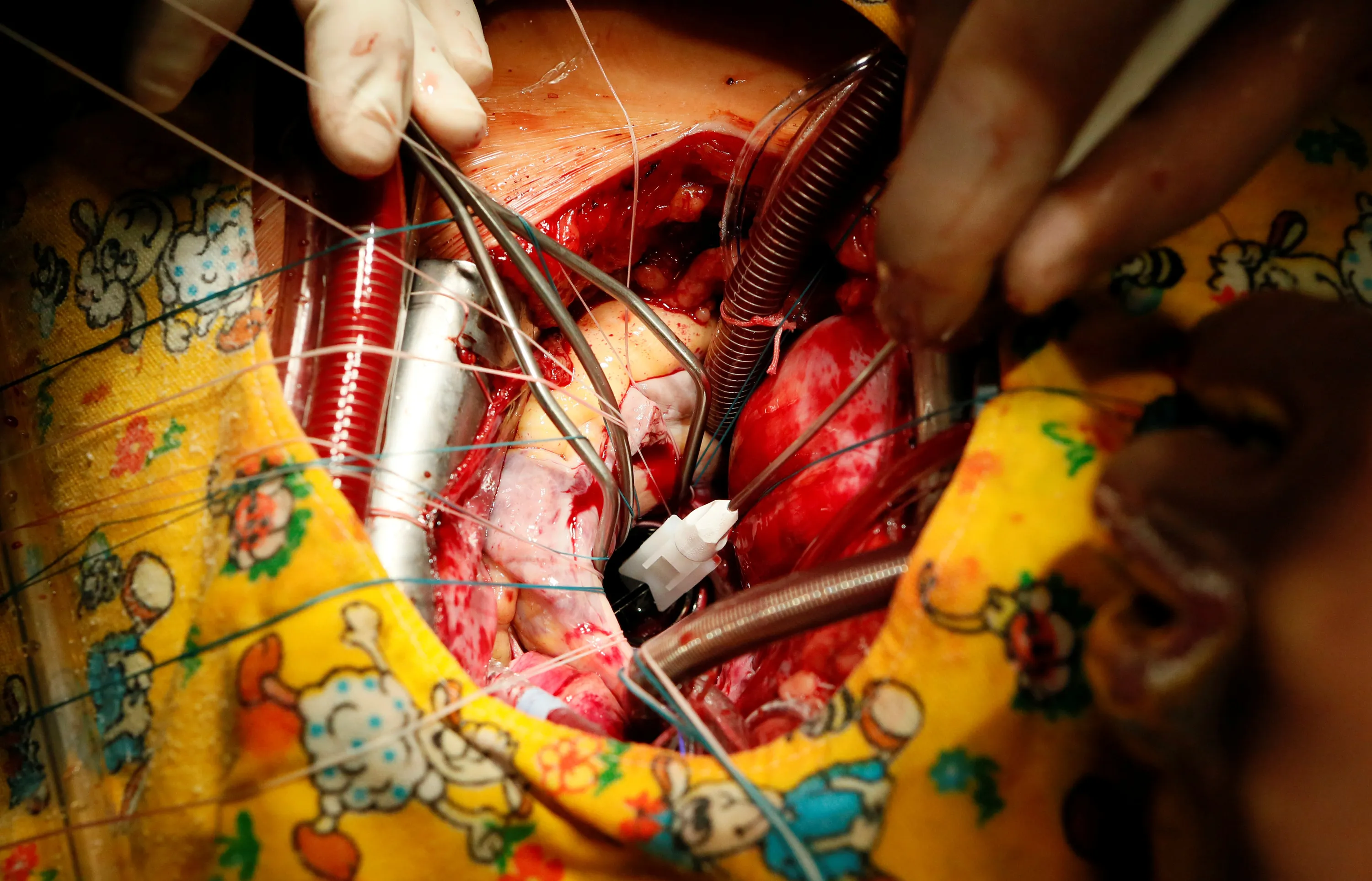 Dmitry Gorbunov, a heart surgeon, with a member of a medical team perform a surgery to implant an artificial heart valve at the Federal Center of Cardiovascular Surgery in the Siberian city of Krasnoyarsk, Russia, September 28, 2016. (Photo by Ilya Naymushin/Reuters)