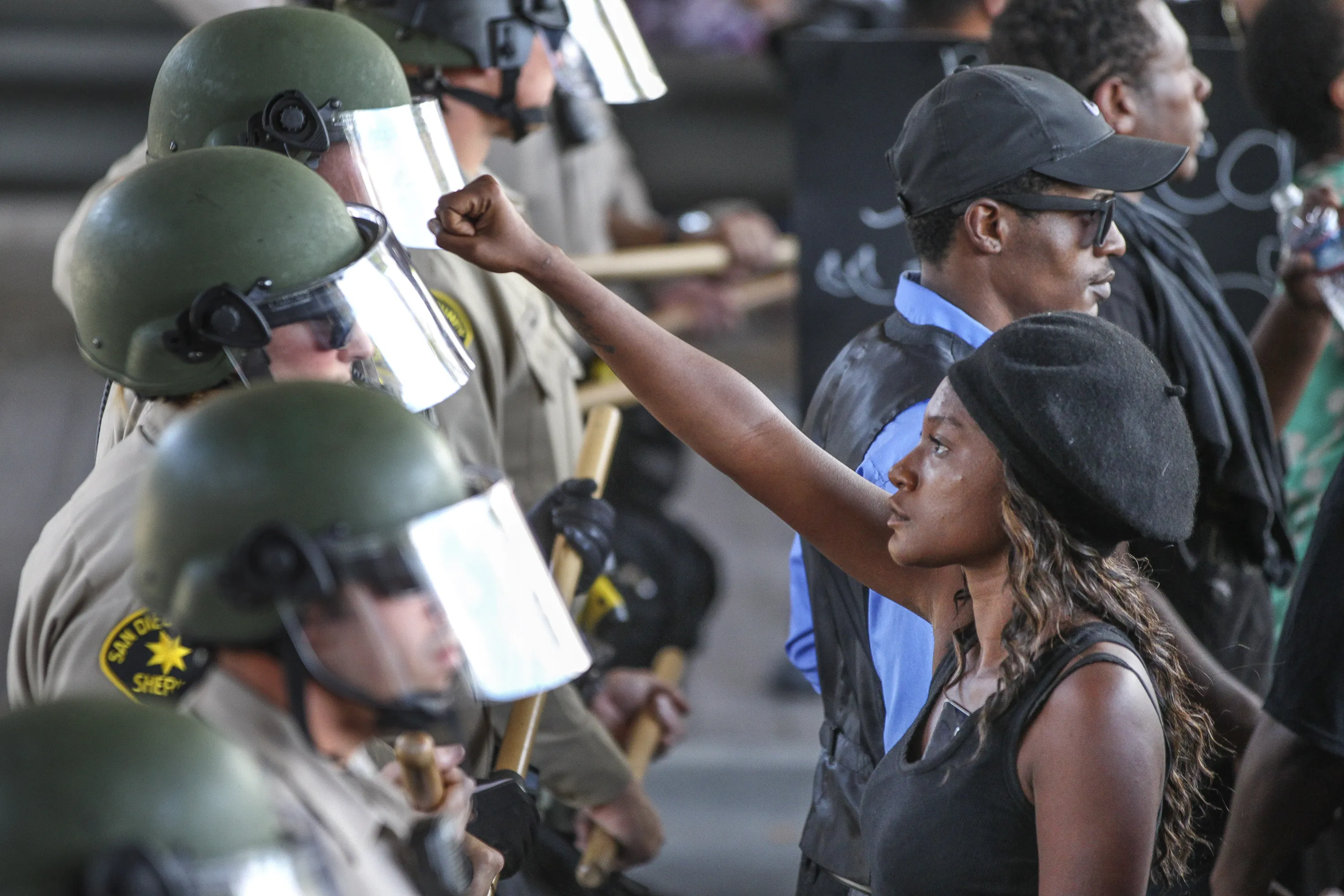 A woman raises her fist in front of a line of police during a protest Wednesday, September 28, 2016, in El Cajon, Calif. (Photo by Hayne Palmour/AP Photo)