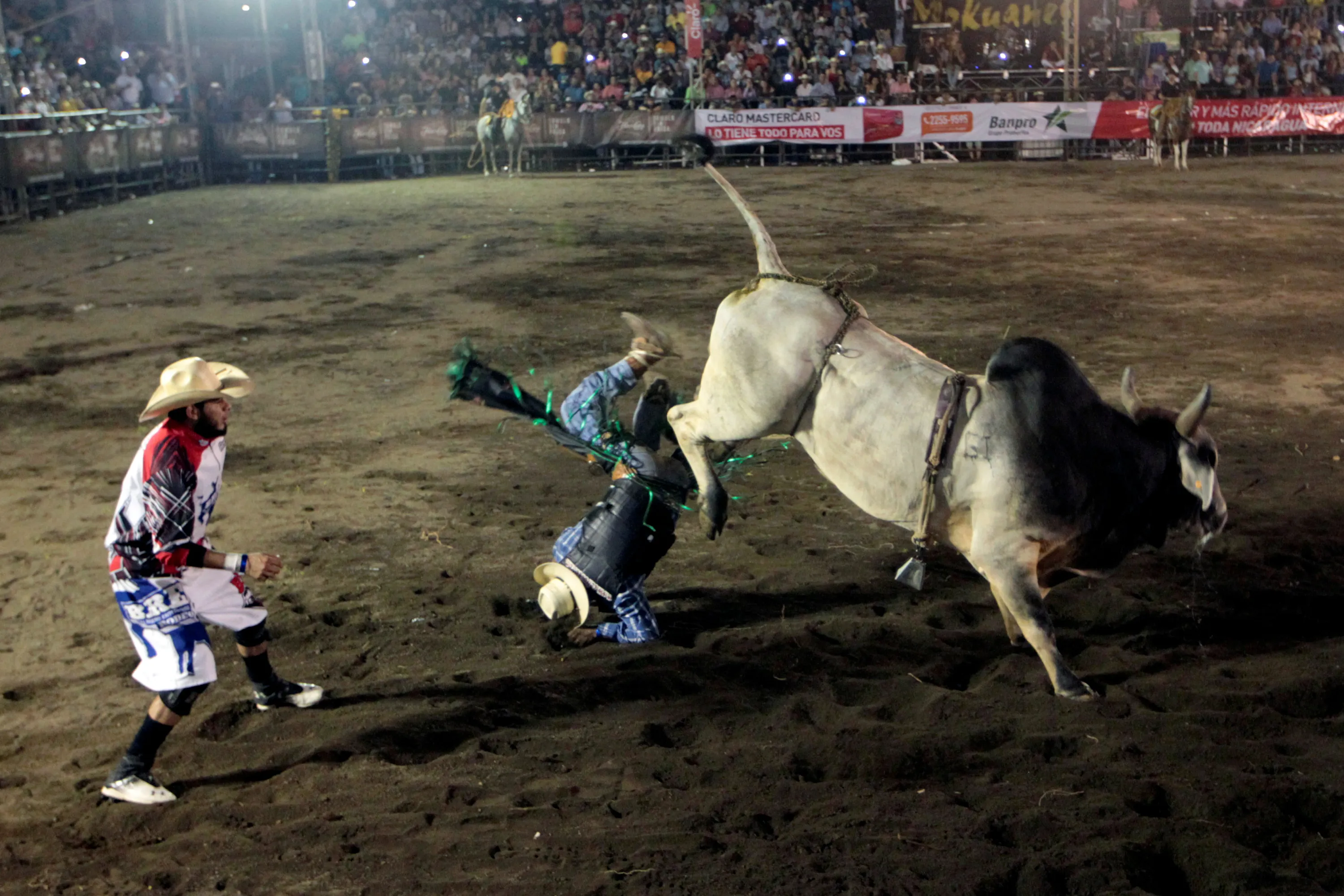 A rodeo bullfighter goes flying off the bull during the bull riding event in Managua, Nicaragua October 1, 2016. Picture taken October 1, 2016. (Photo by Oswaldo Rivas/Reuters)