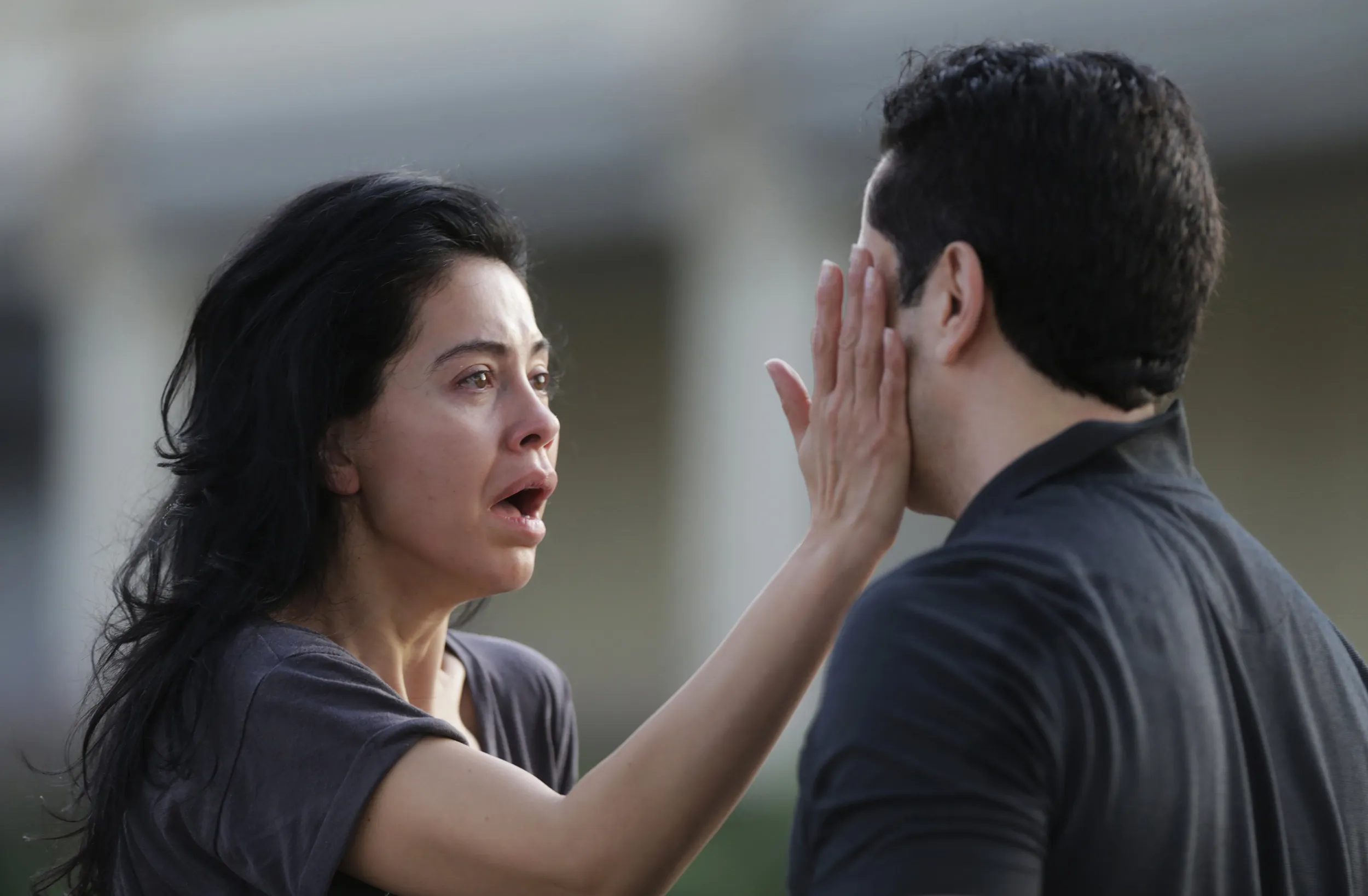 Jennifer Molleda looks at the blood specked face of her husband, Alan Wakim, who had bullets whiz by his face after going through his windshield during a shooting that left multiple people injured and the shooter dead, Monday, Sept. 26, 2016, in Houston. A disgruntled lawyer who had numerous weapons randomly shot at drivers before being killed by police. (Mark Mulligan/Houston Chronicle via AP)