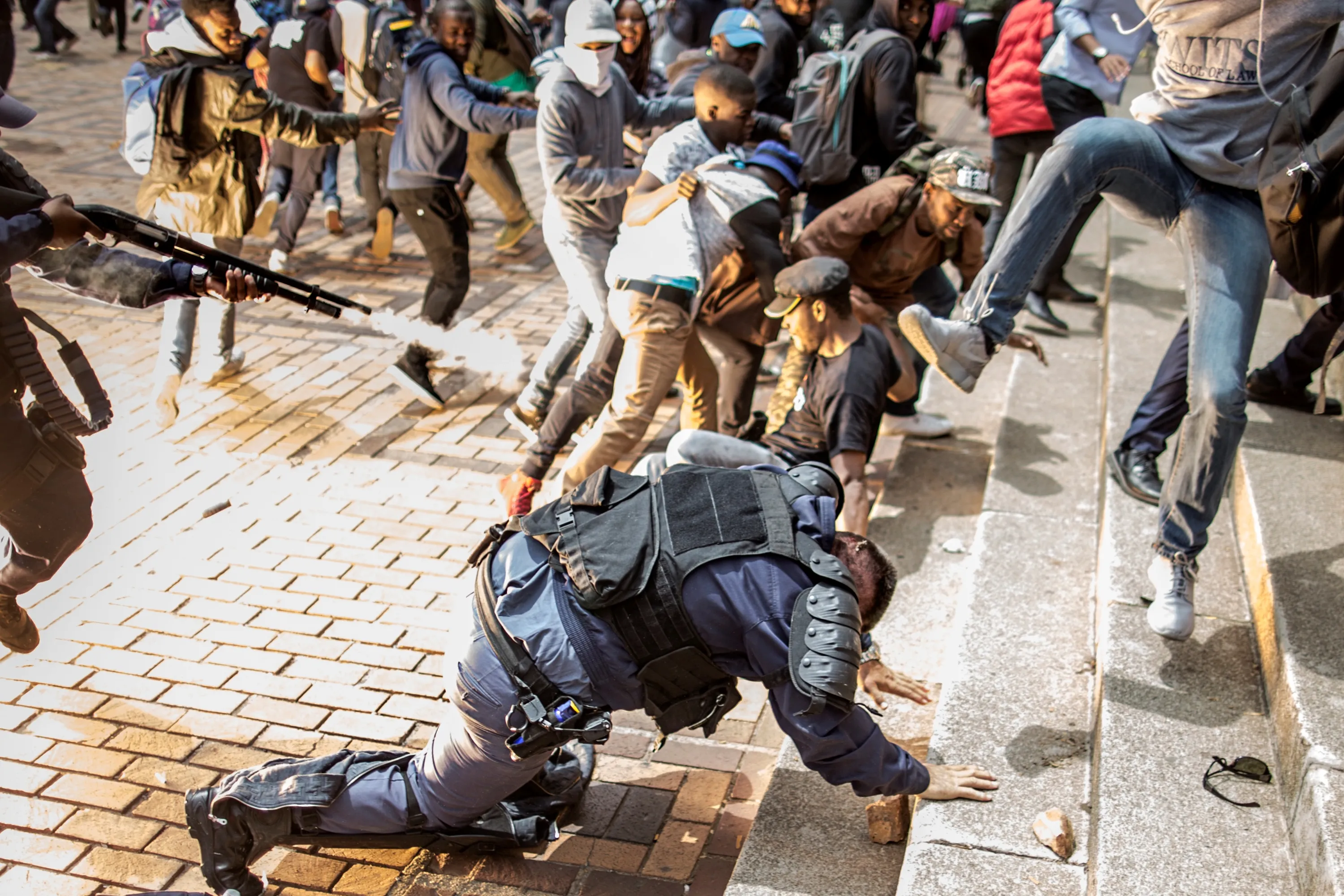 The flash of an exploding stunt grenade is seen while an University of Witwatersrand student jumps on a falling policeman while another policeman discharged his rubber bullet loaded rifle during a running battle with the police forces on campus during a mass demonstration on October 4, 2016 in Johannesburg. South African police fired rubber bullets, stun grenades and teargas at student protesters in Johannesburg as authorities tried to re-open the prestigious Wits University after weeks of demonstrations. The university, along with many campuses across South Africa, has been closed for at least two weeks during protests over tuition fees, with violent clashes regularly erupting between students, police and private security guards. (Photo by Marco Longari/AFP Photo)