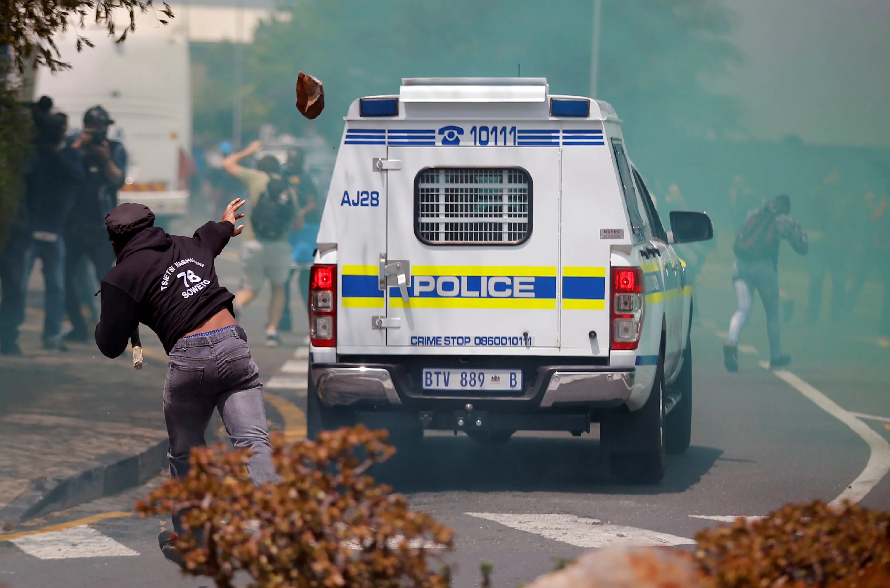 A student throws a rock at a South African police car during clashes over high tuition fees at Johannesburg's University of the Witwatersrand, South Africa, October 4, 2016. (Photo by Siphiwe Sibeko/Reuters)