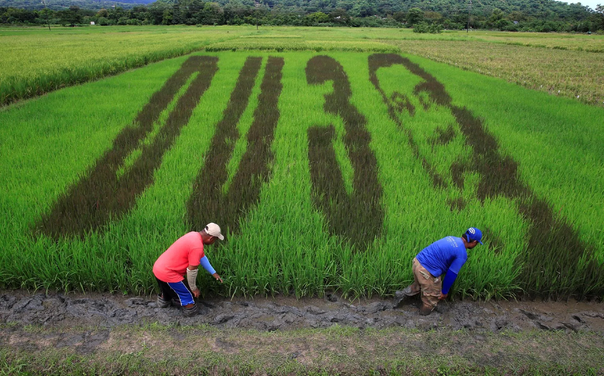 An artwork featuring the image of Philippine President Rodrigo Duterte with the letters D U and the number 3, a word play on the President's surname “DU30”, is seen on a rice paddy in Los Banos city, Laguna province, south of Manila October 6, 2016. (Photo by Romeo Ranoco/Reuters)