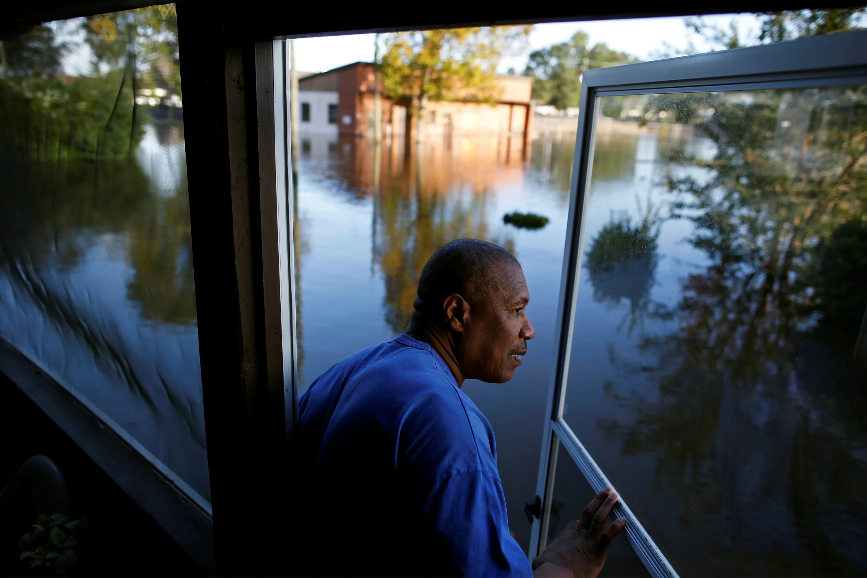 Eric McClary of West Mulberry Lane checks flood levels while checking on his flooded home after the effects of Hurricane Matthew in Goldsboro, North Carolina, U.S., October 12, 2016. (Photo by Randall Hill/Reuters)
